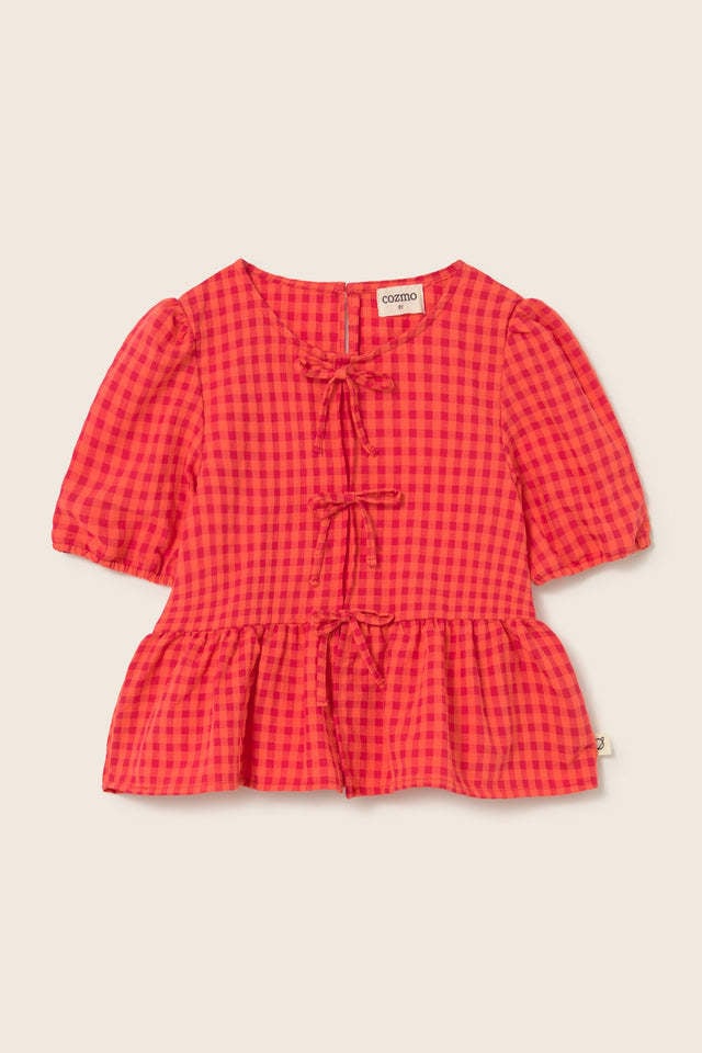 • Blouse en coton avec un motif à carreaux vichy présentant un col rond avec une ouverture en forme de goutte dans le dos.