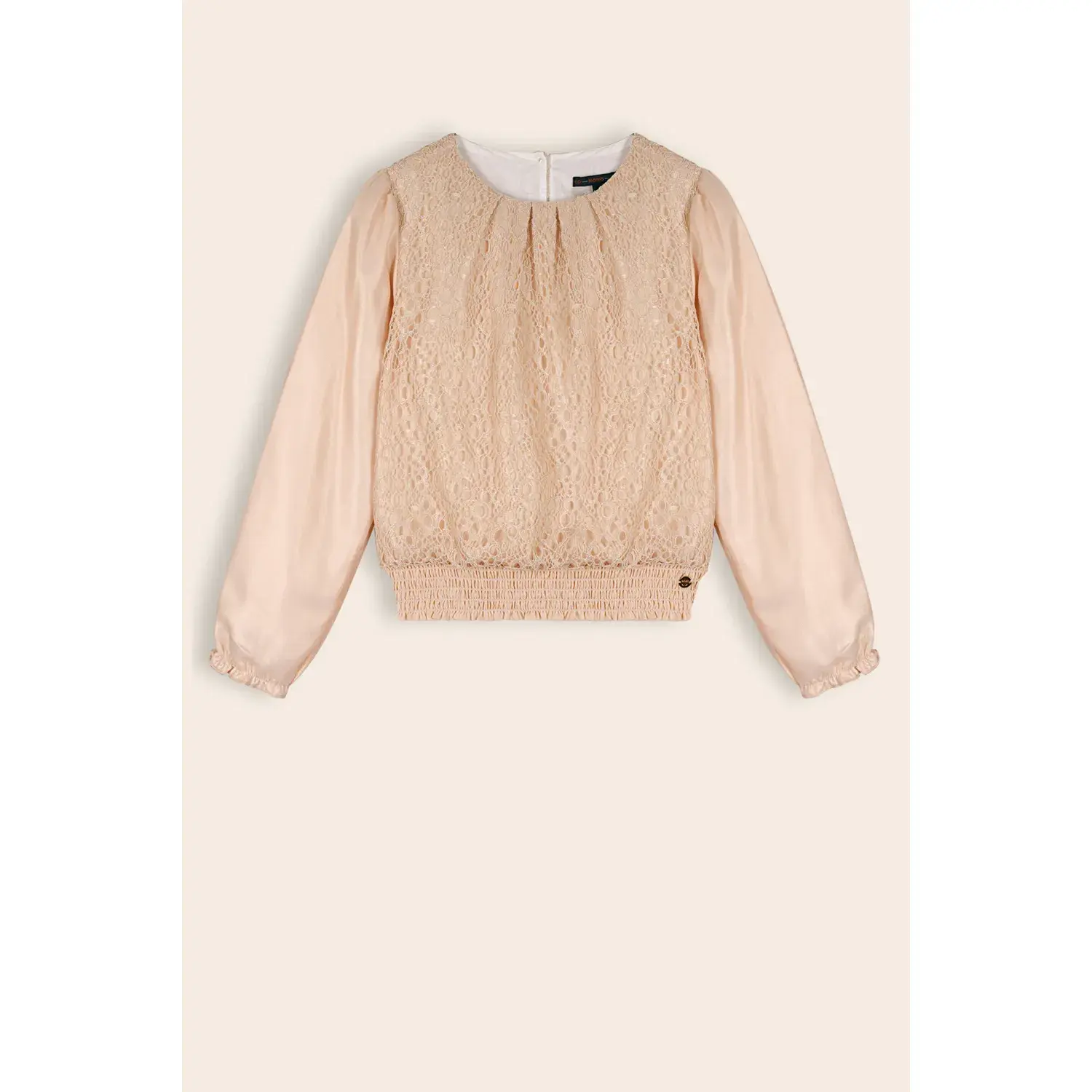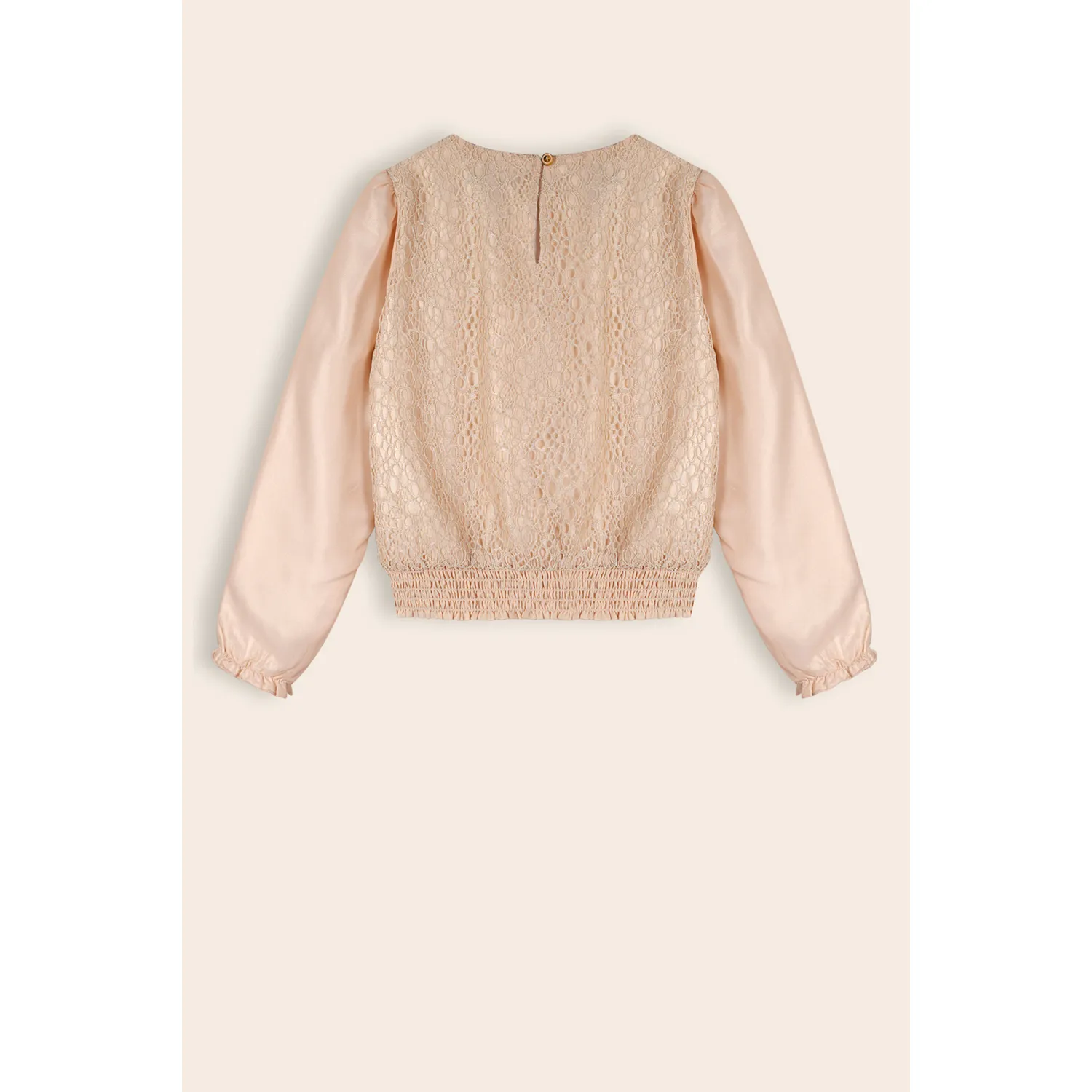 • Blouse manches longues garnie de dentelle avec élastique à la taille.