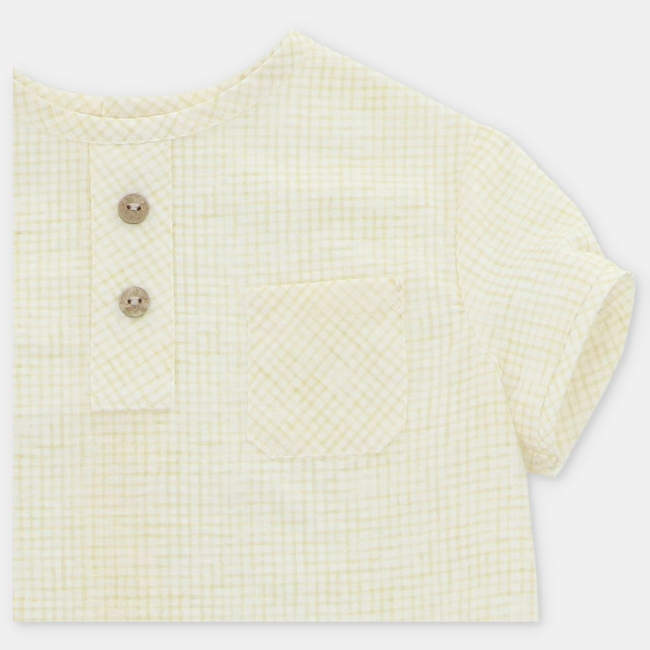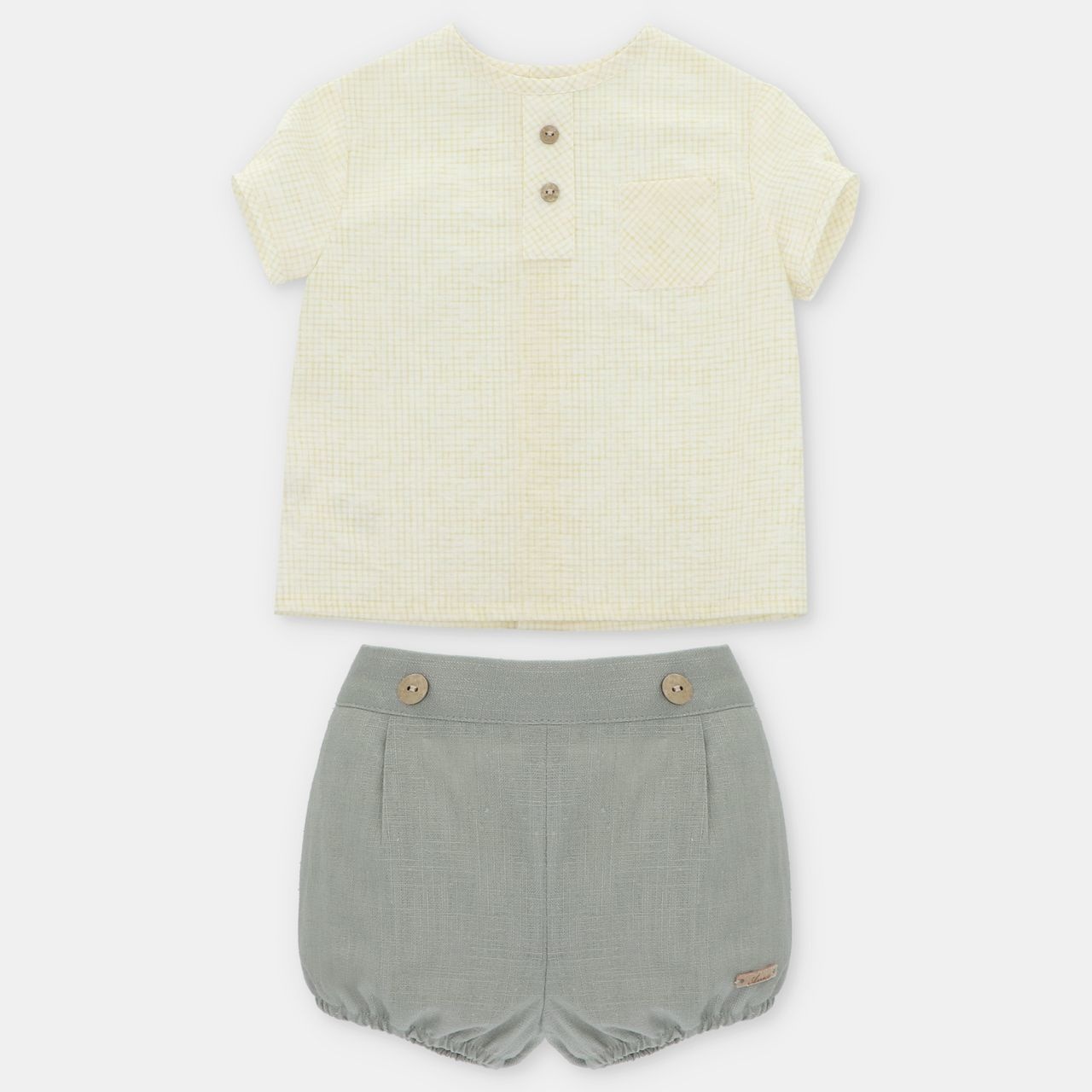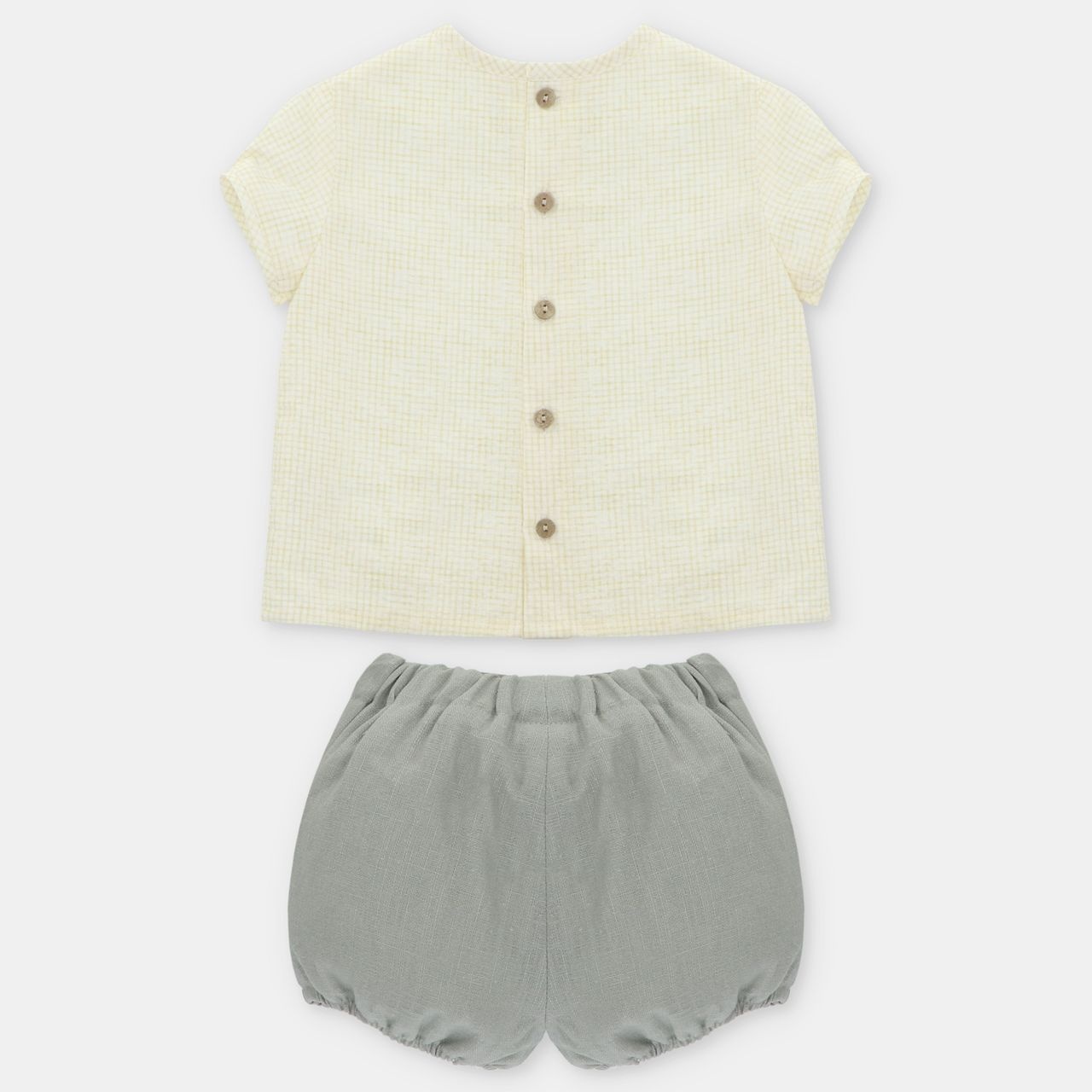 • Ensemble incluant un haut manches courtes jaune à rayures ainsi qu'un bloomer gris.