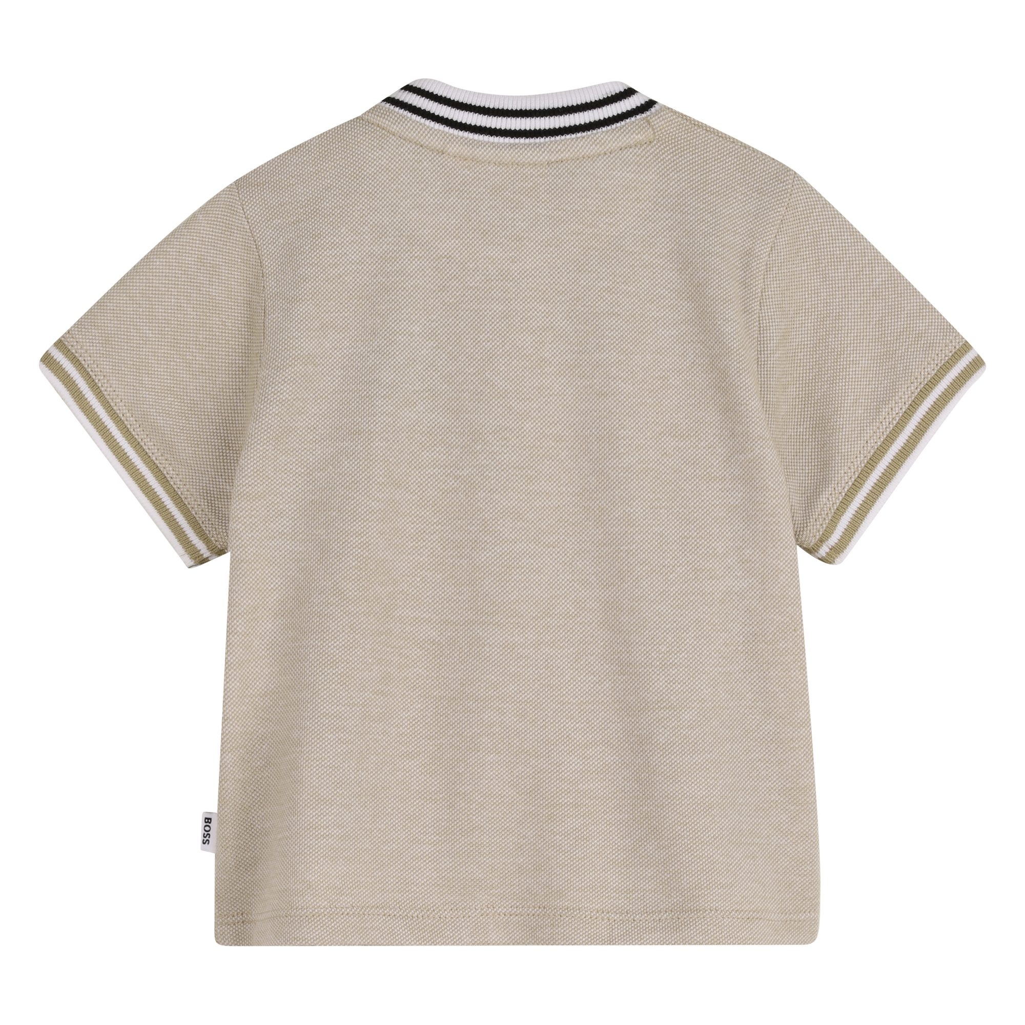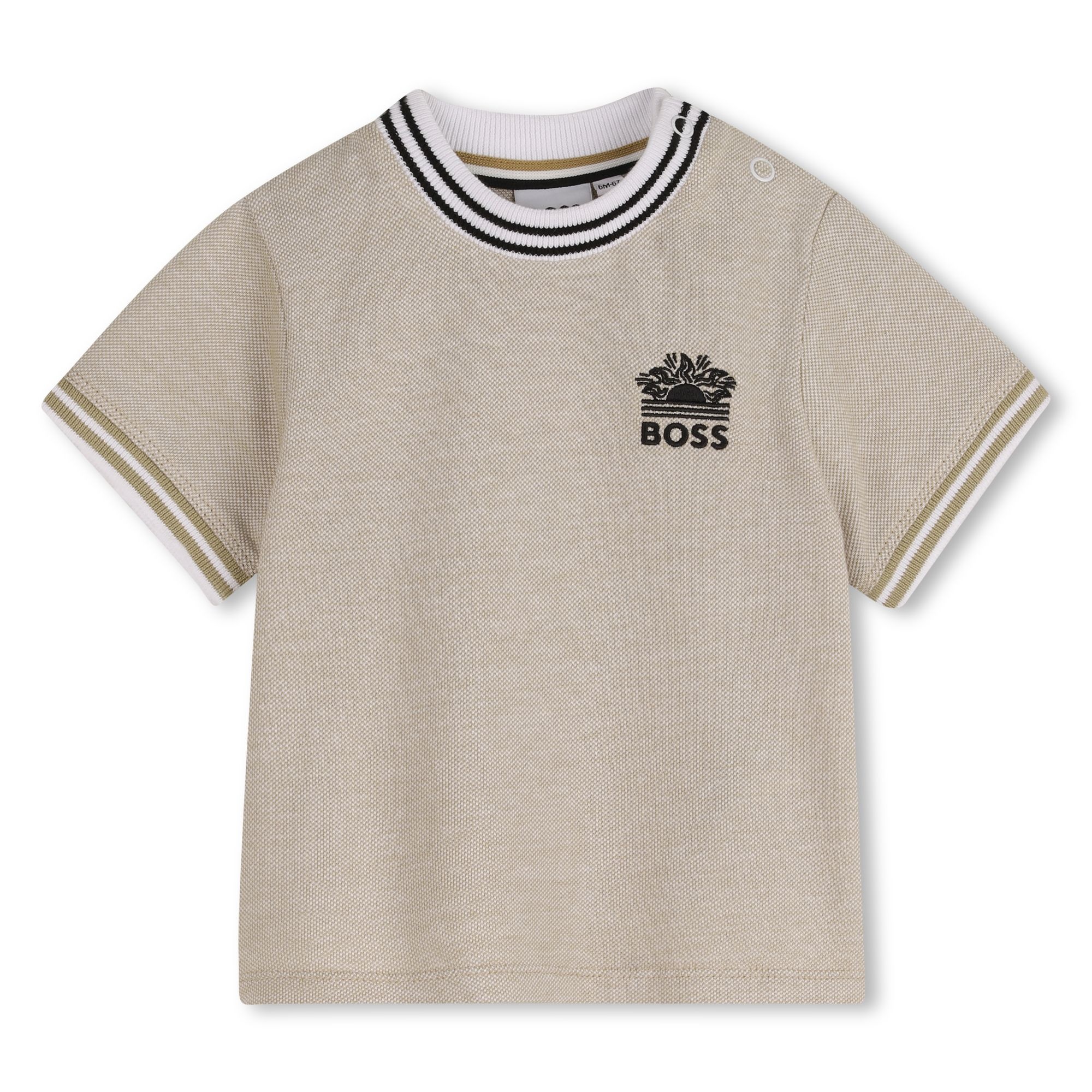 • T-Shirt beige avec logo noir tissé à l'avant et boutons pression à l'épaule gauche.