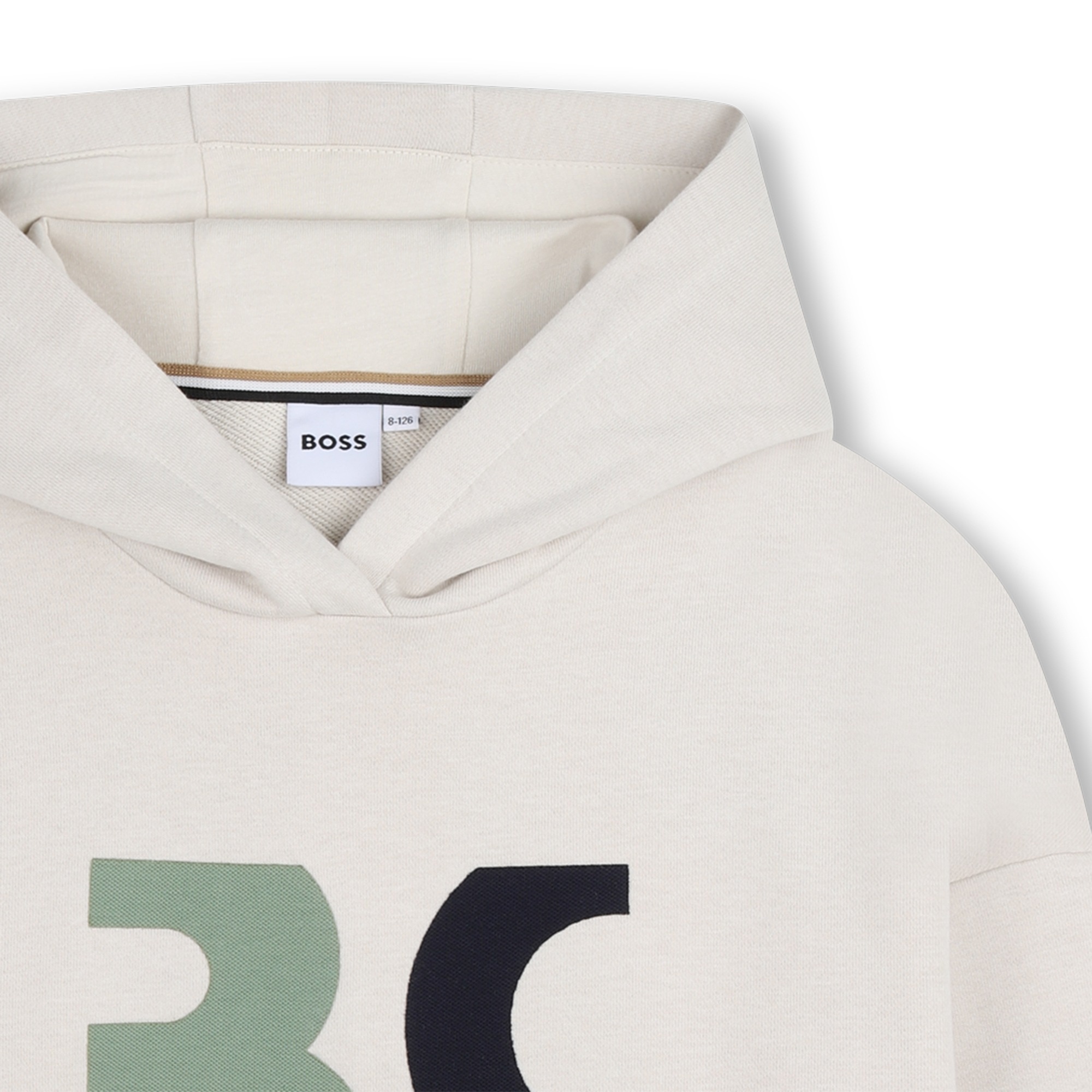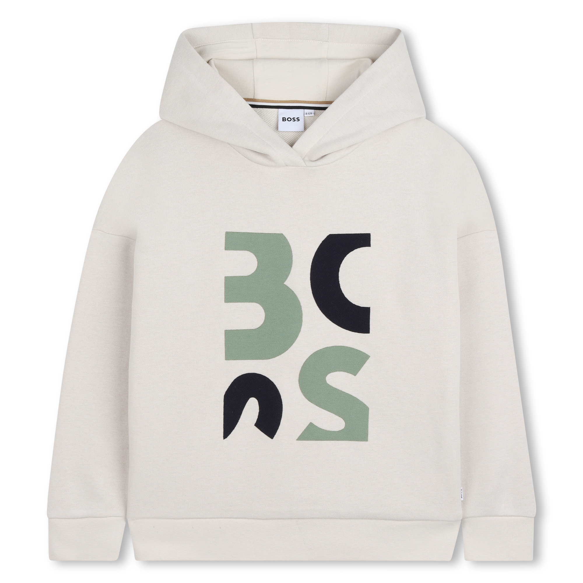 • Chandail à manches longues et capuchon beige avec imprimé marine et vert à l'avant.