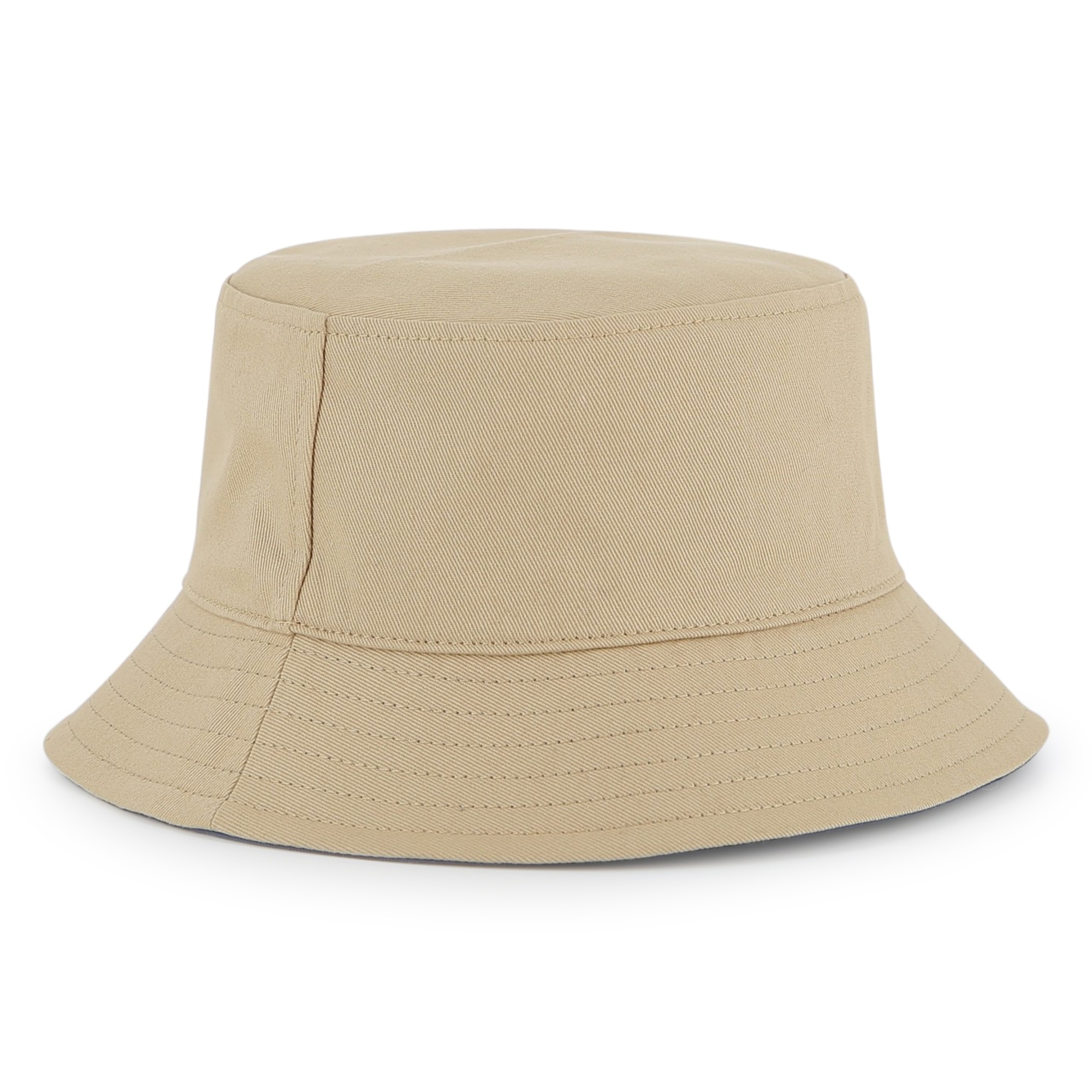 • Chapeau bob réversible beige et marine avec logo rouge.