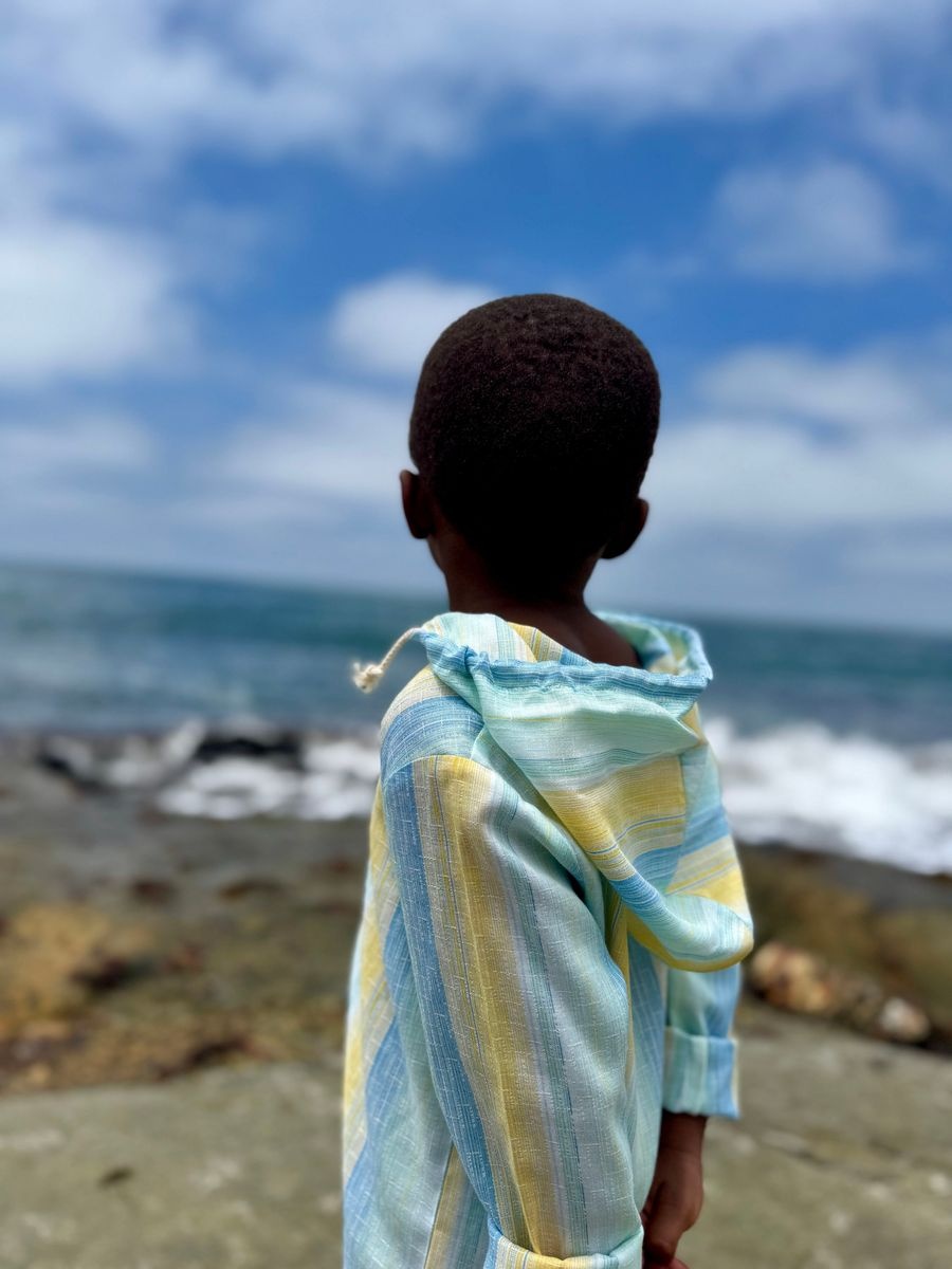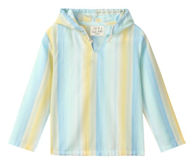 • Chemisier bleu et jaune manches longues avec capuche.