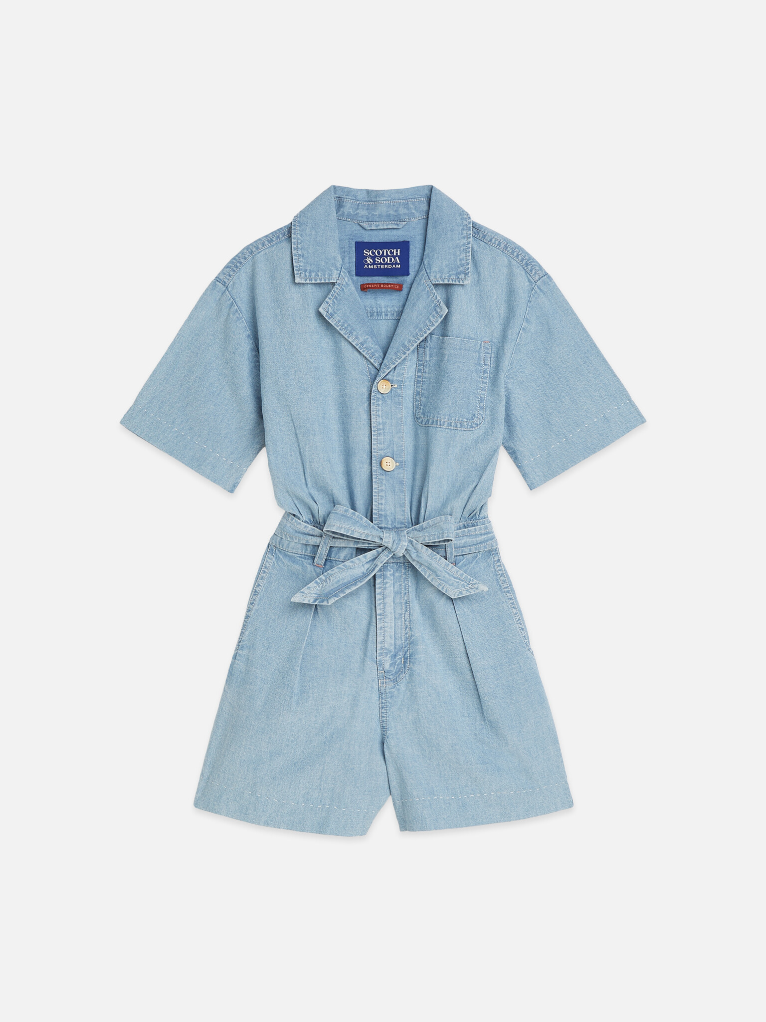 • Combi-court bleu jean avec pochette à l'avant. Boutonnière et ceinture intégrée.