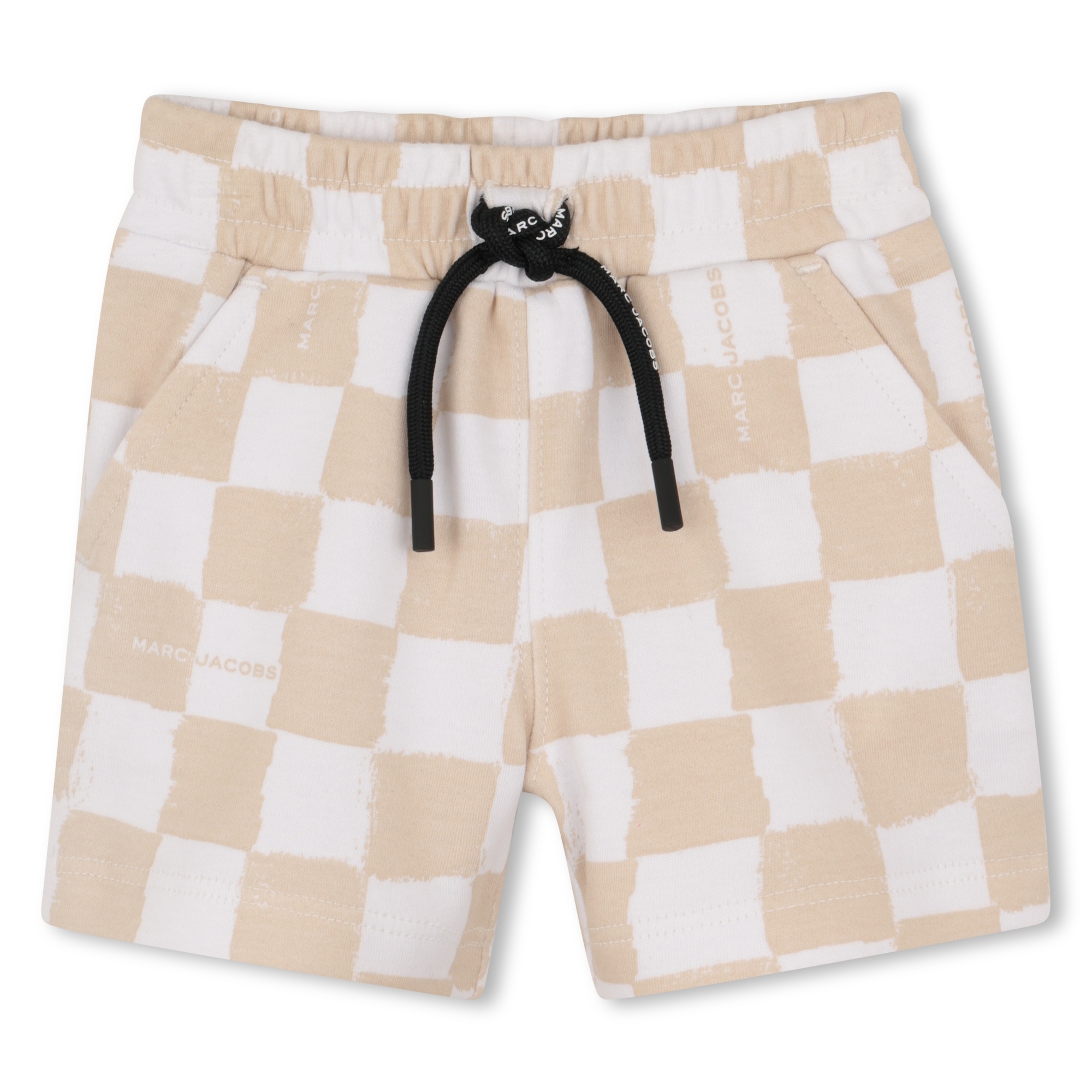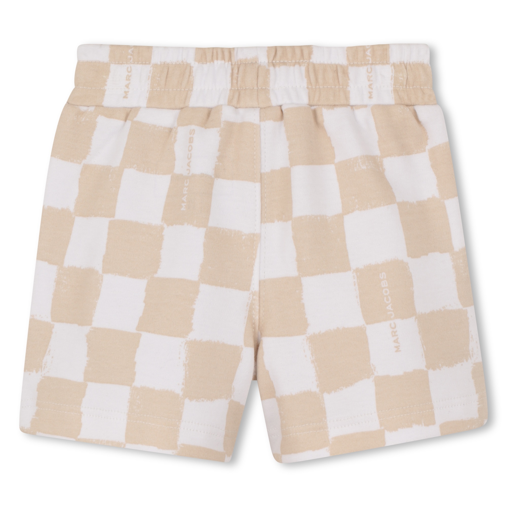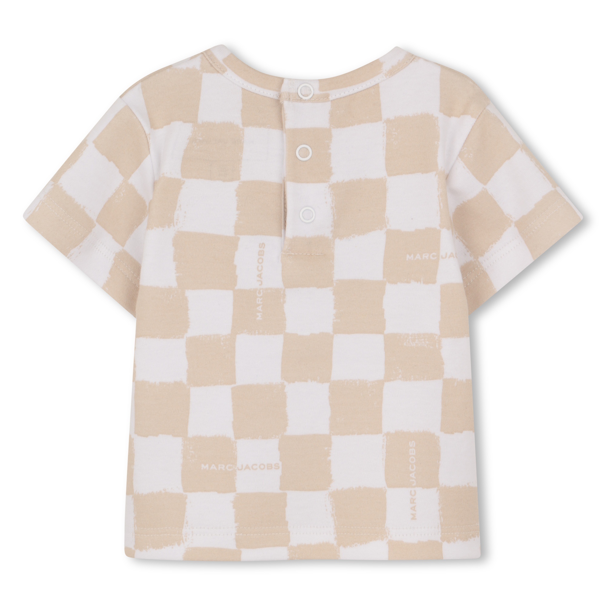 • Ensemble deux pièces comprenant un t-shirt carreauté blanc et beige avec logo noir à l'avant et petit short élastique correspondant.