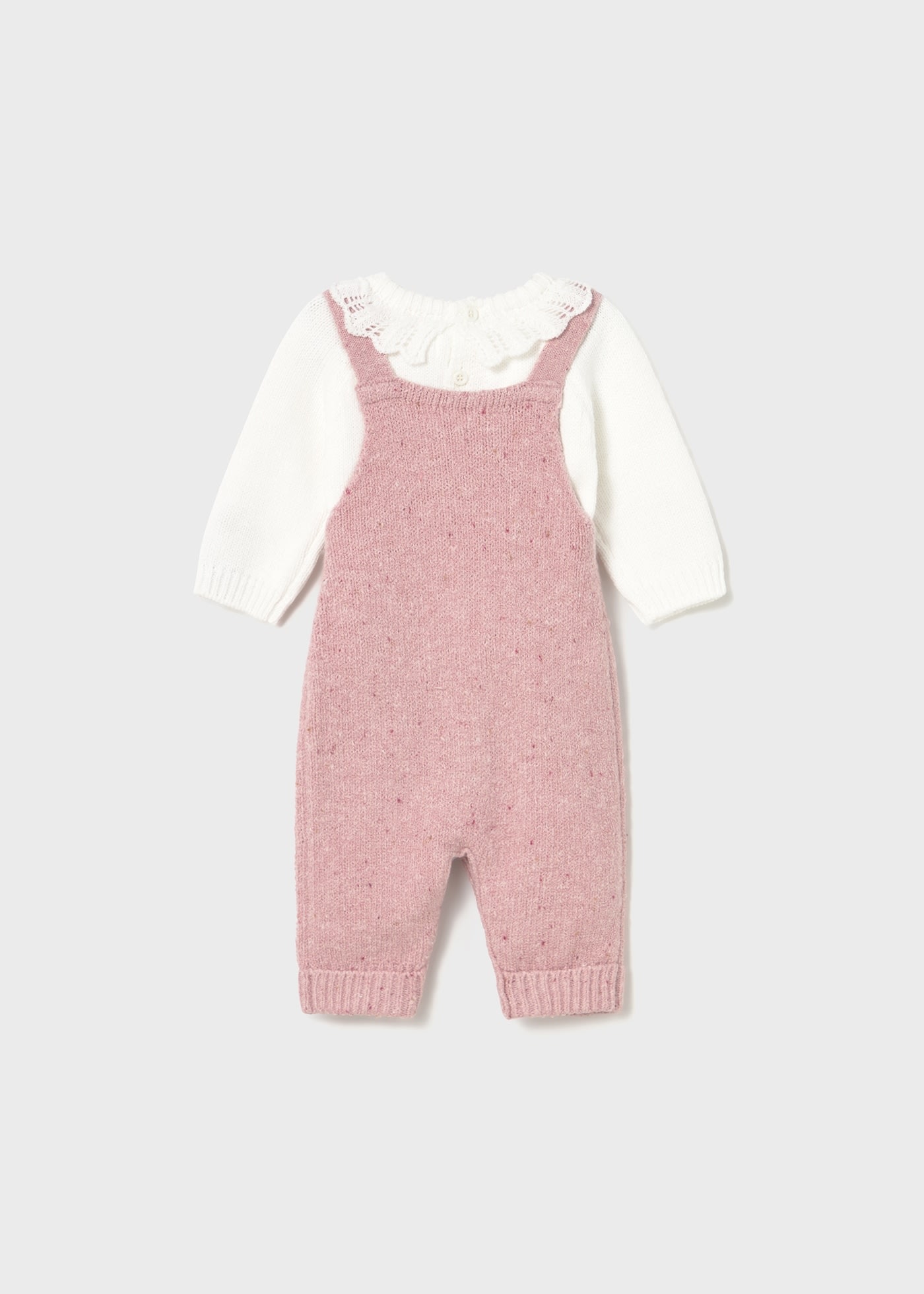 • Ensemble 2 pièces en tricot incluant un haut de couleur crème et une salopette rose avec boutons pressions à l'entrejambe.