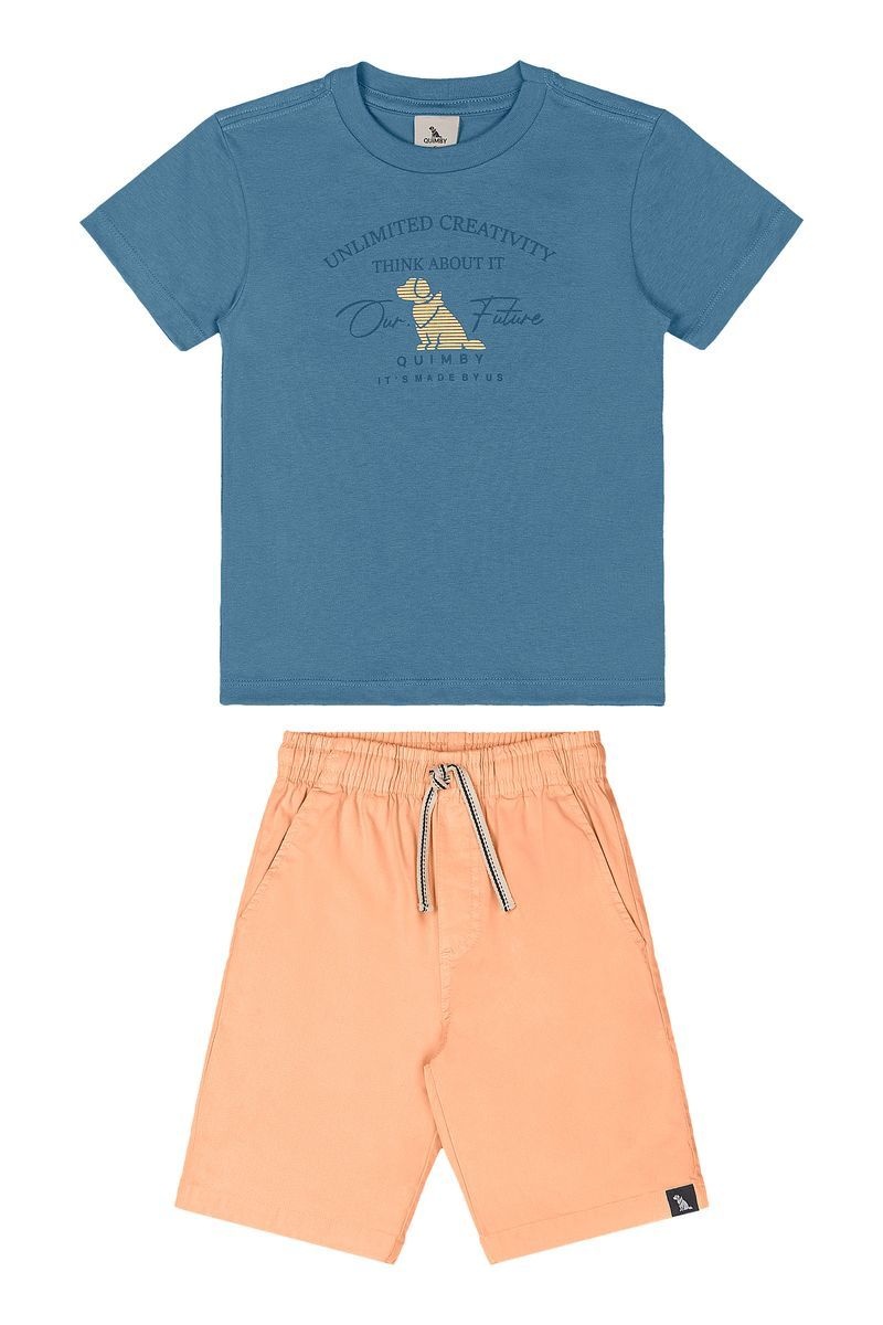 • Ensemble 2 pièces incluant un t-shirt bleu et un bermuda orangé.