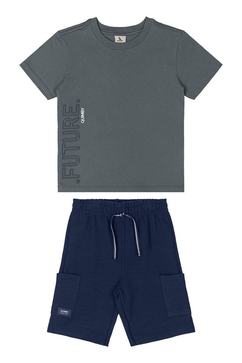 • Ensemble 2 pièces incluant un t-shirt gris ainsi qu'un shorts marine à taille élastique.