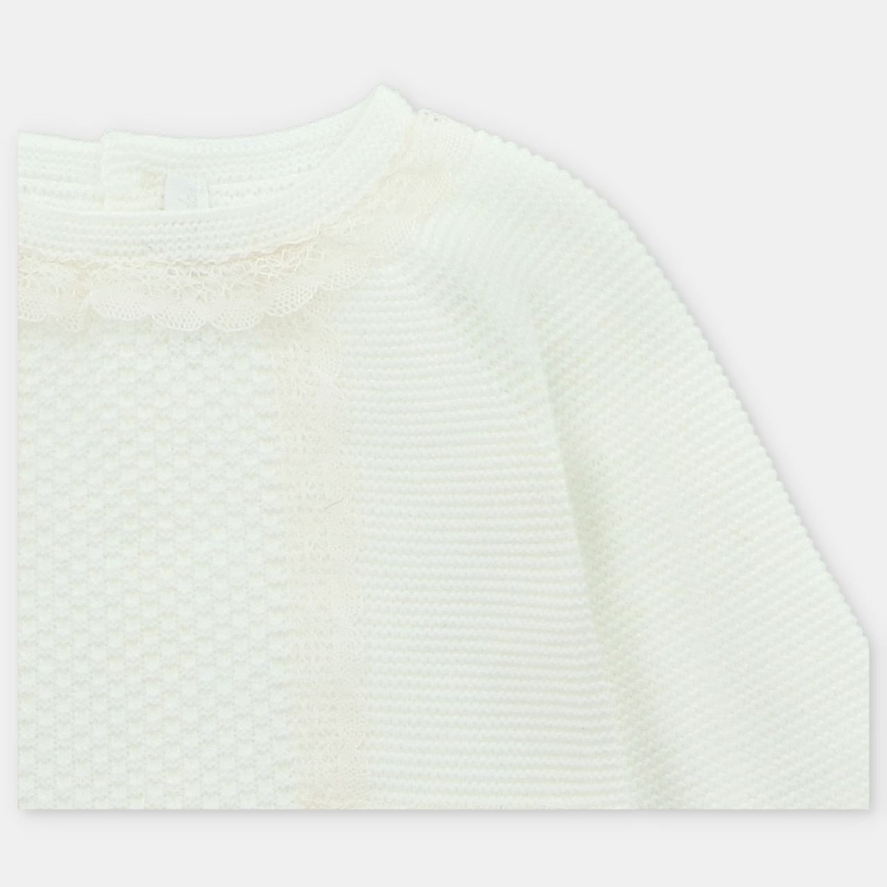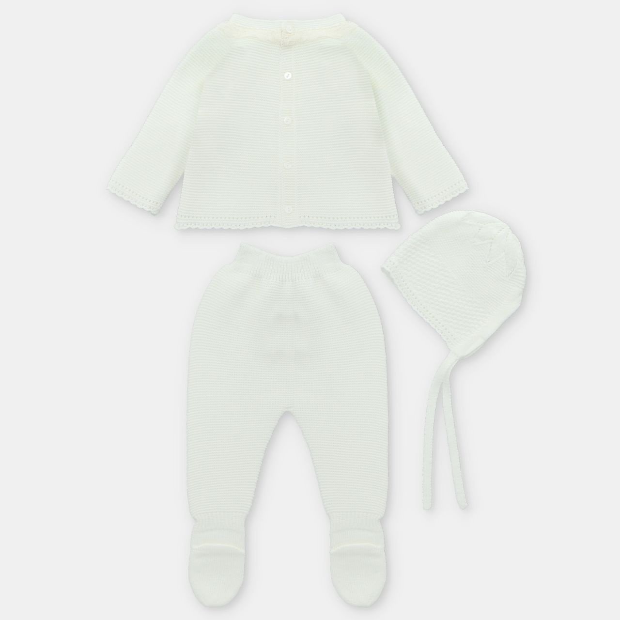 • Ensemble 3 pièces blanc cassé en tricot incluant un haut boutonné au dos, un pantalon à pattes et un bonnet.