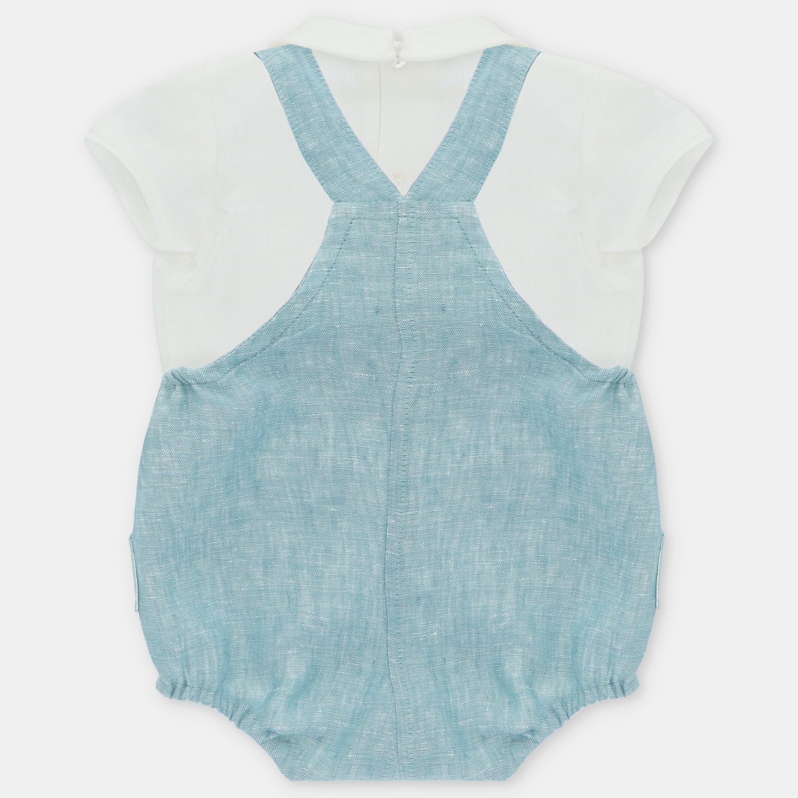• Ensemble incluant un chemisier blanc manches courtes ainsi qu'une salopette courte turquoise avec boutonnières à l'entrejambe.