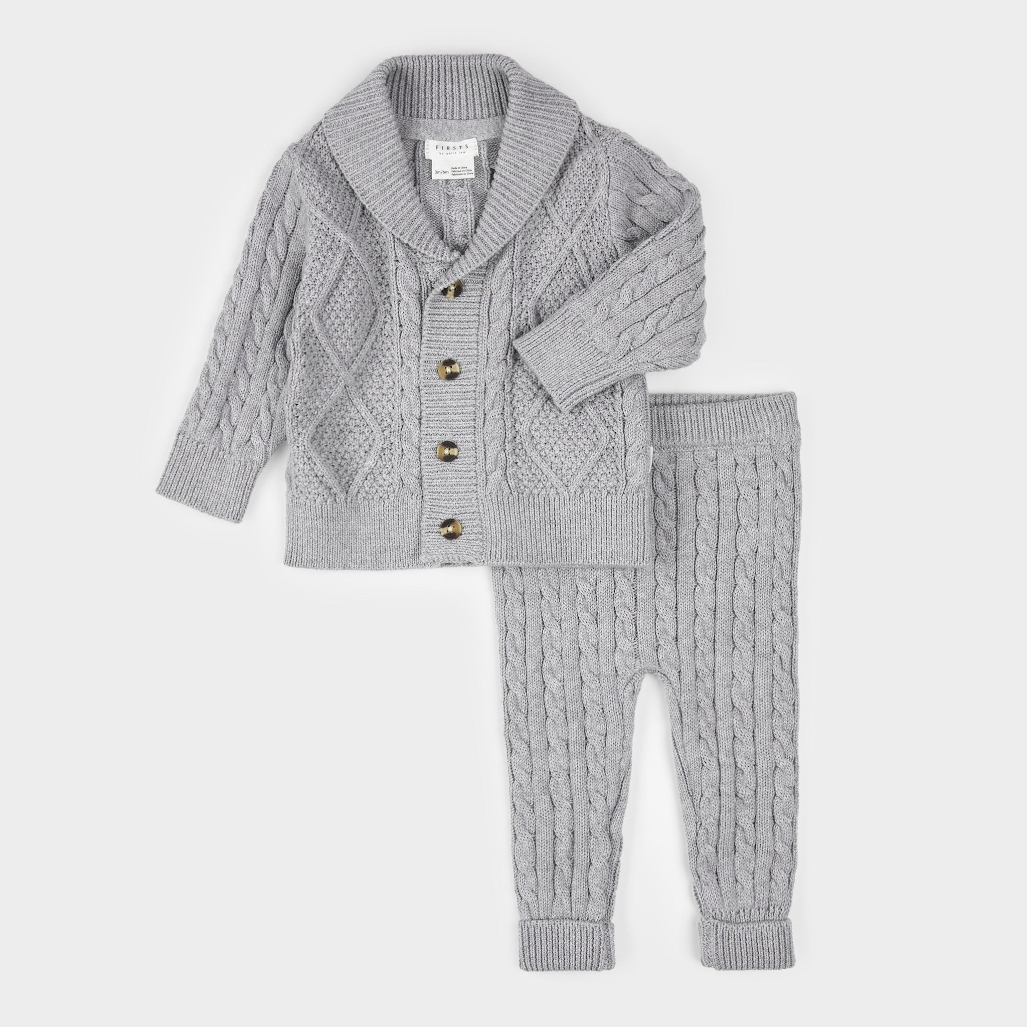 • Ensemble en tricot 2 pièces, confectionné à partir de 100% Coton Biologique, comprenant un cardigan et un pantalon assorti.