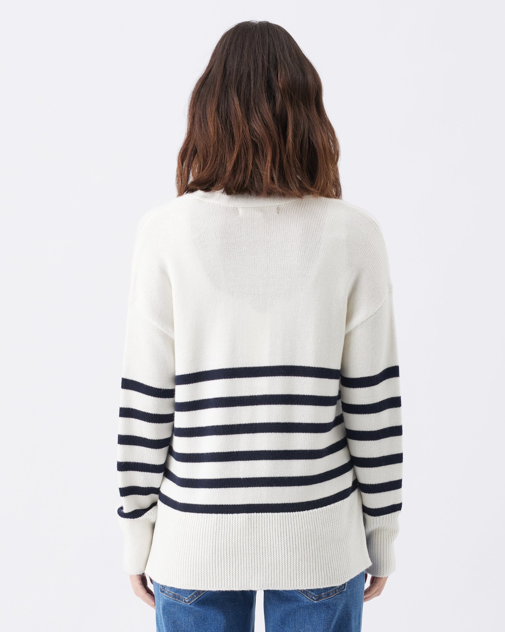 • Ce haut en tricot présente une coupe classique et décontractée, avec un motif à rayures horizontales sur tout le corps et des boutons-pression sur la couture latérale pour faciliter l'allaitement.