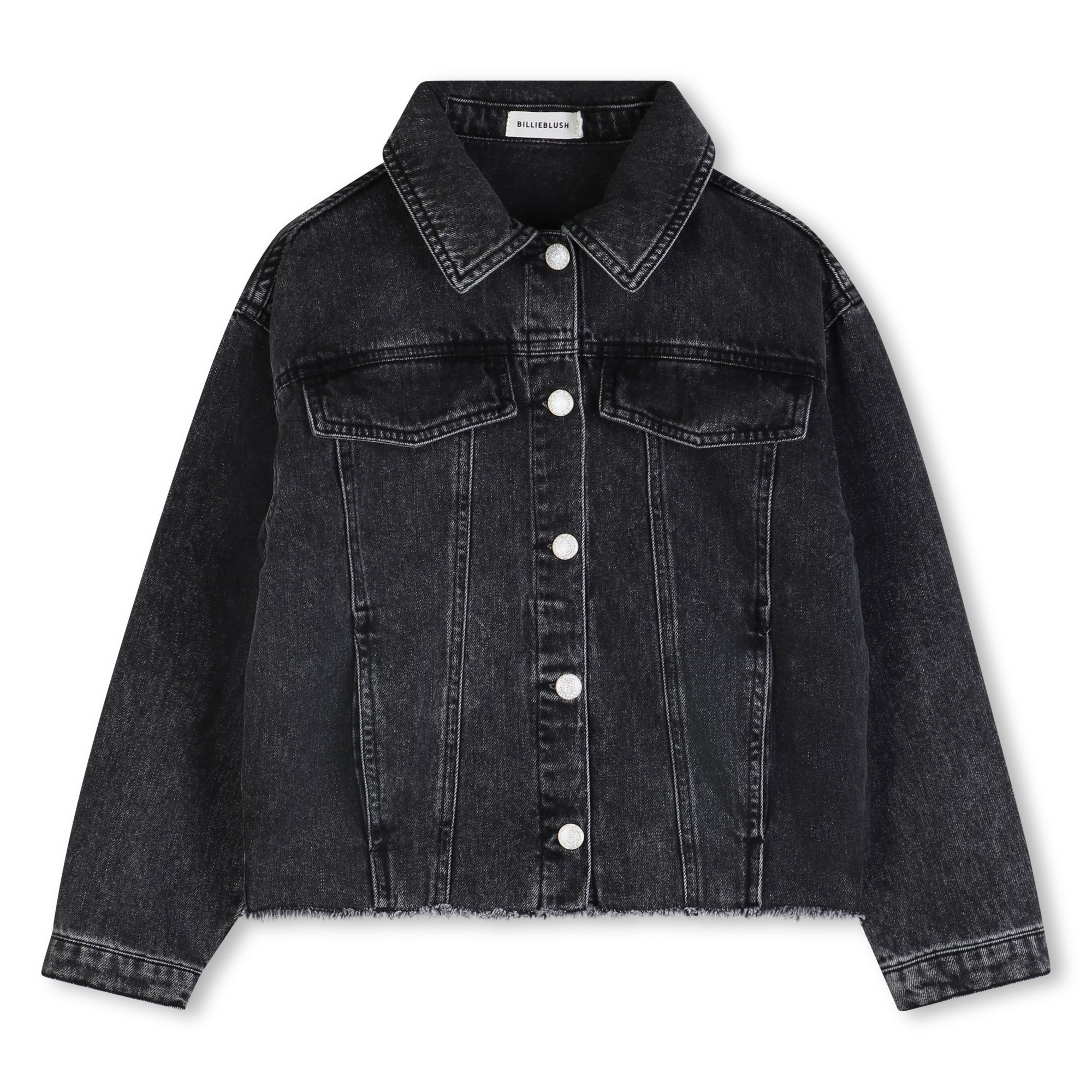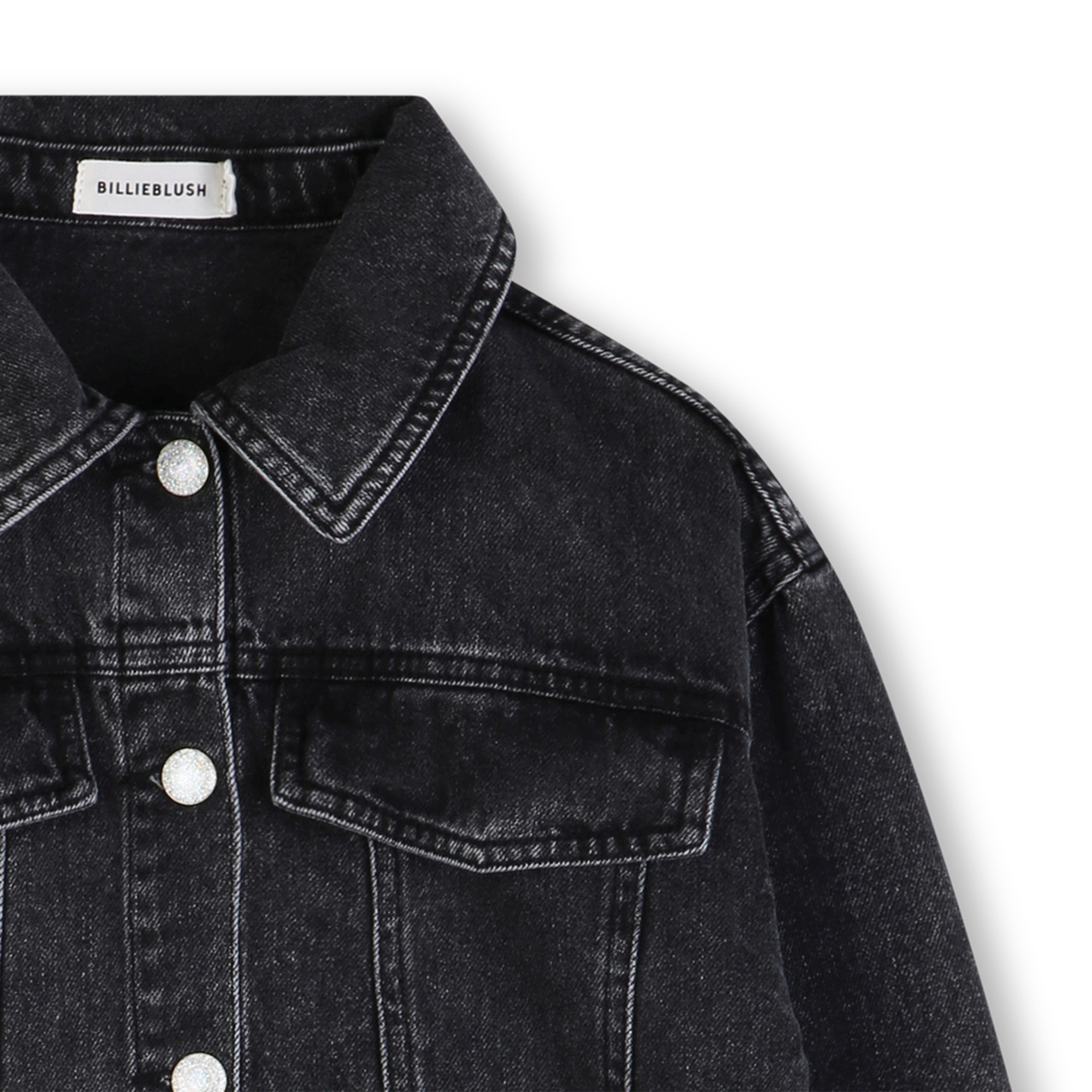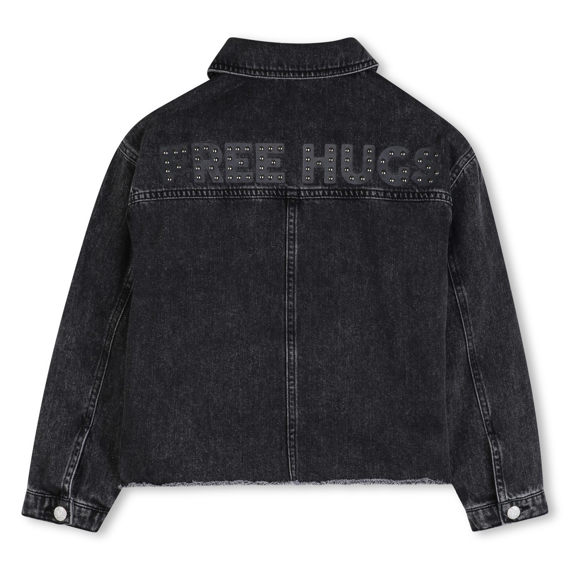 • Jacket en jeans noir avec boutonnière brillante et écriture clouté dans le dos.