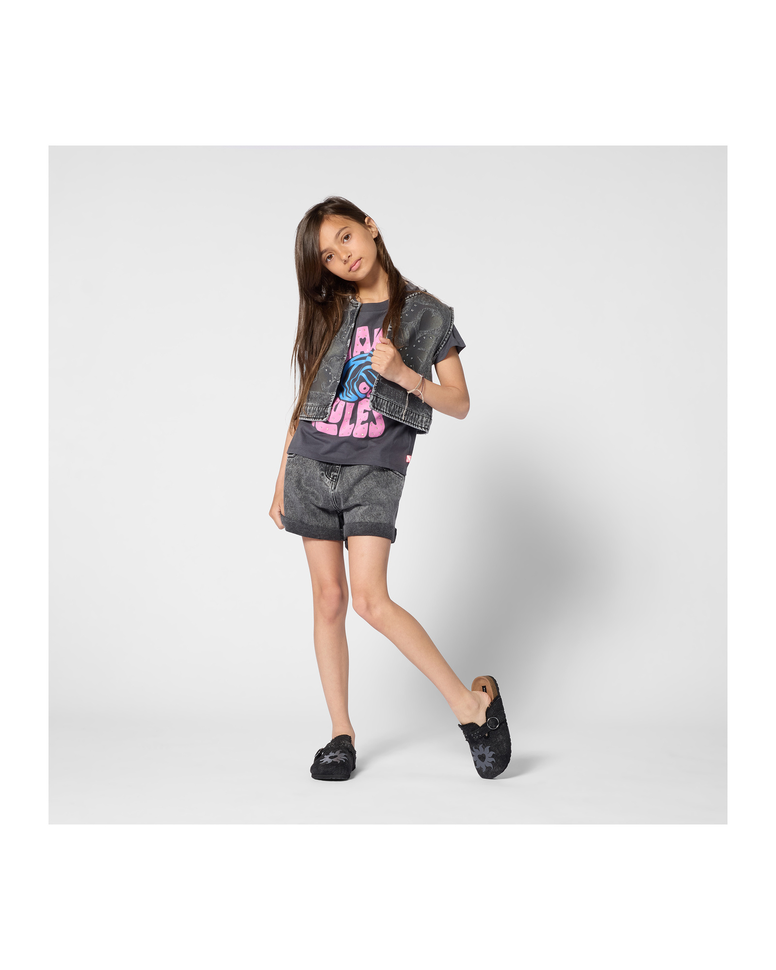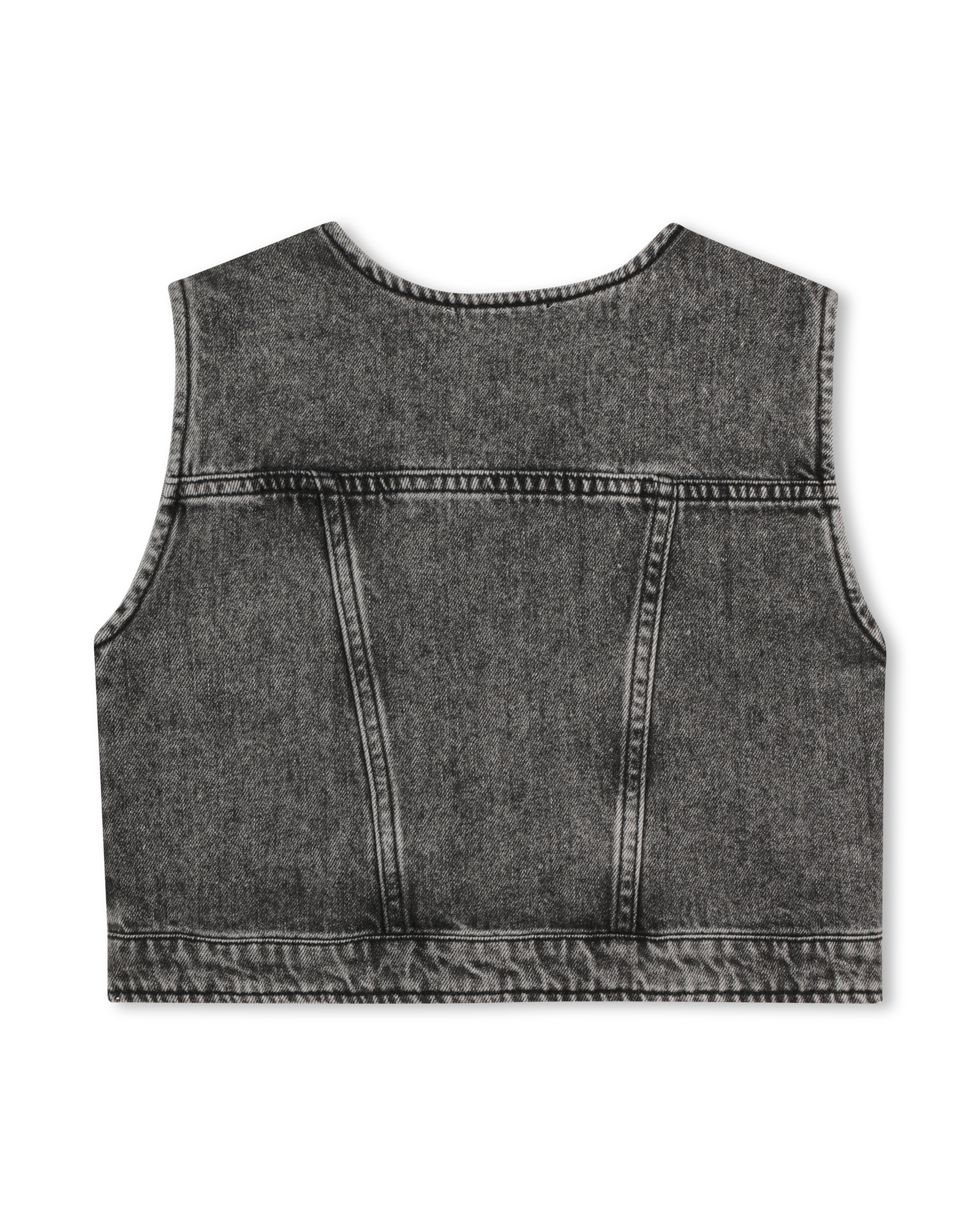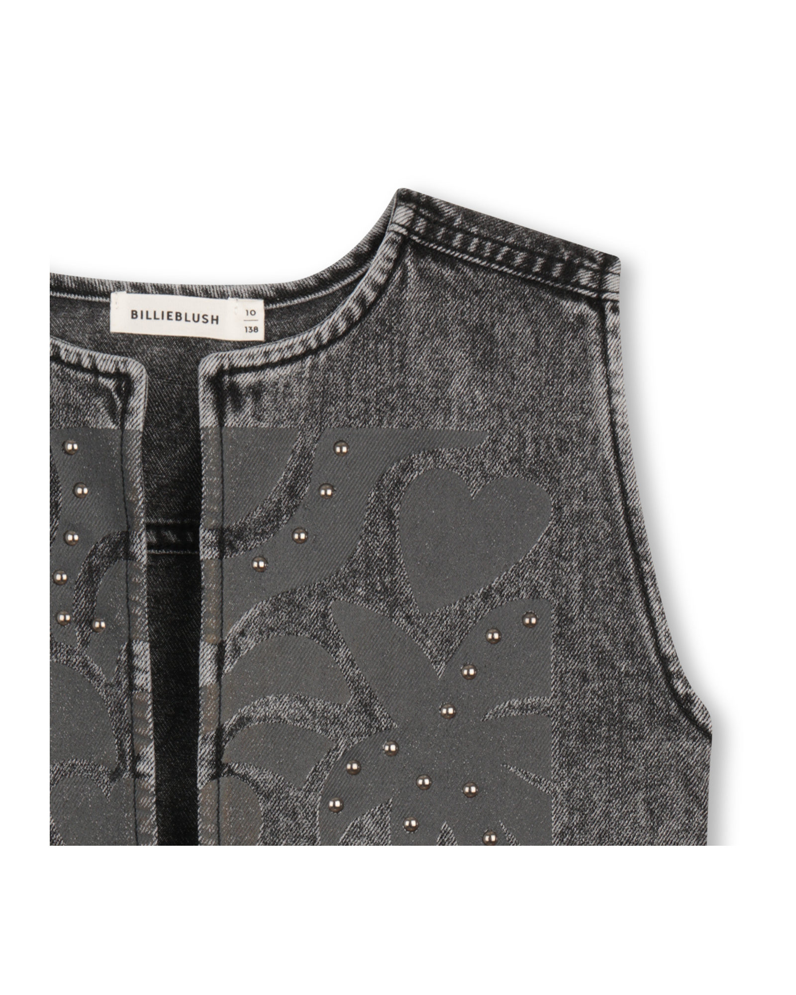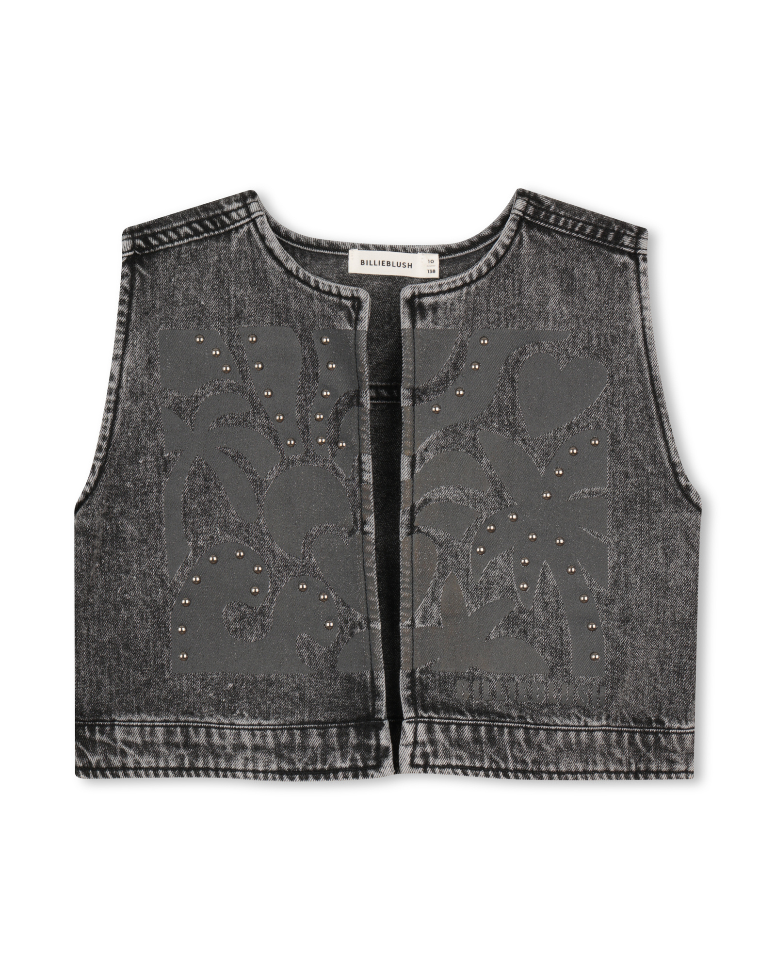 • Veste sans manches en jeans noir avec imprimé et détails cloutés argentés.