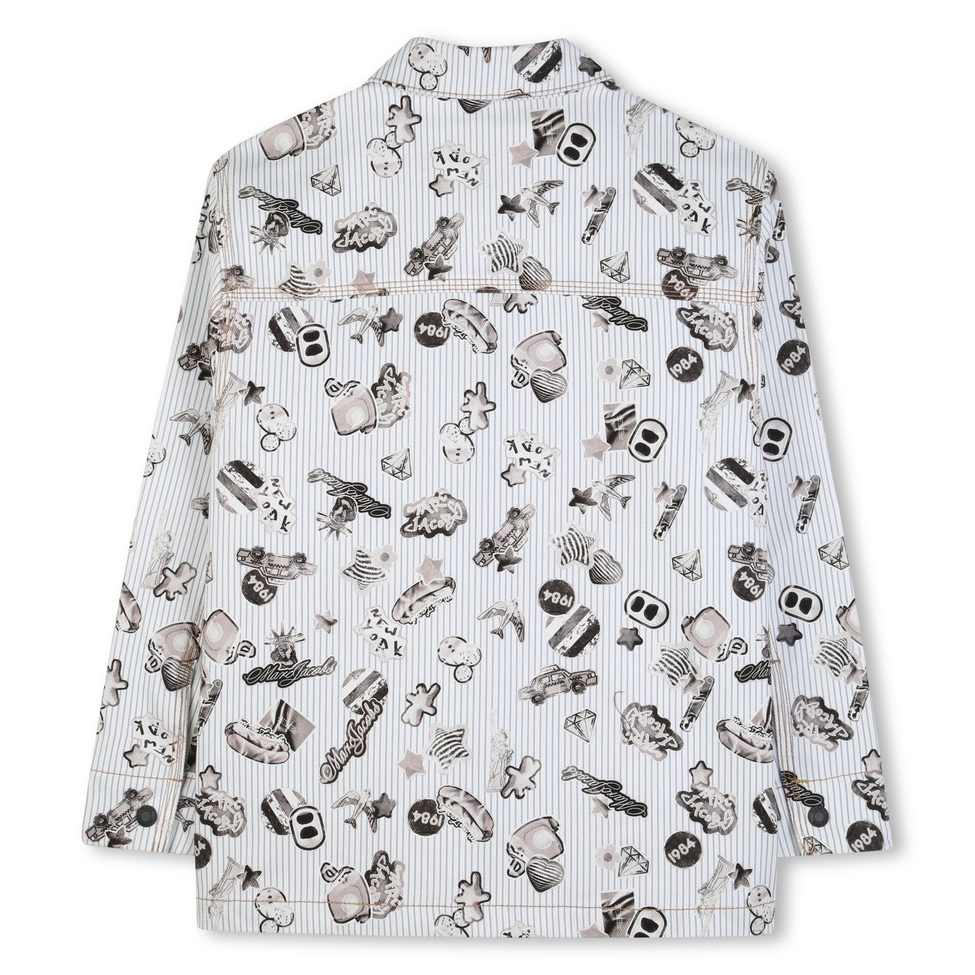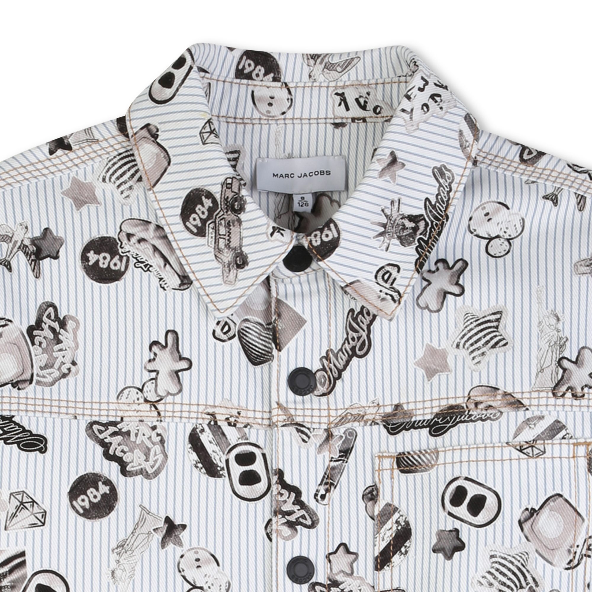 • Jacket en tissu de style jeans, blanc ligné bleu avec imprimé charcoal et boutons pression.