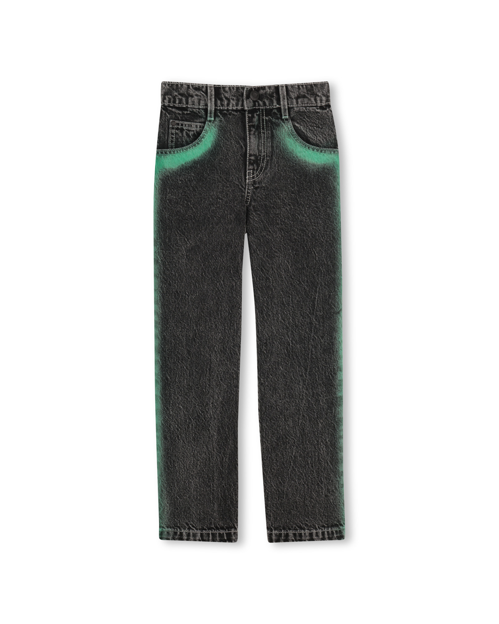 • Jeans noir délavé avec coutures vertes.