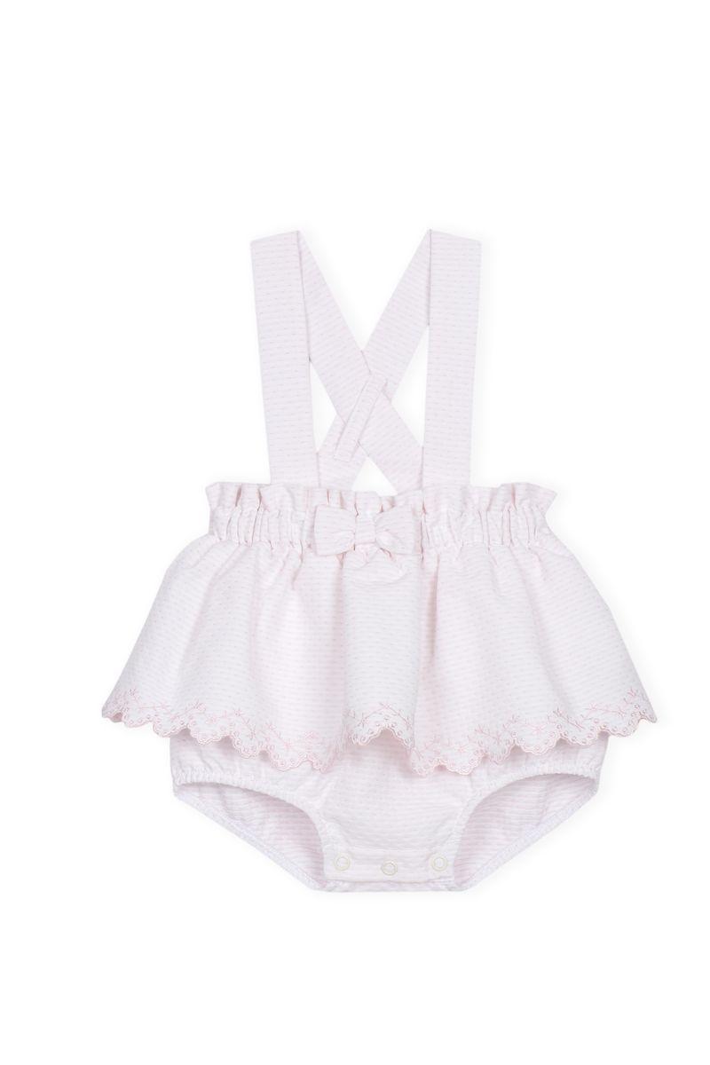 • Jupe rose pâle avec cache-couche intégré et bretelles.