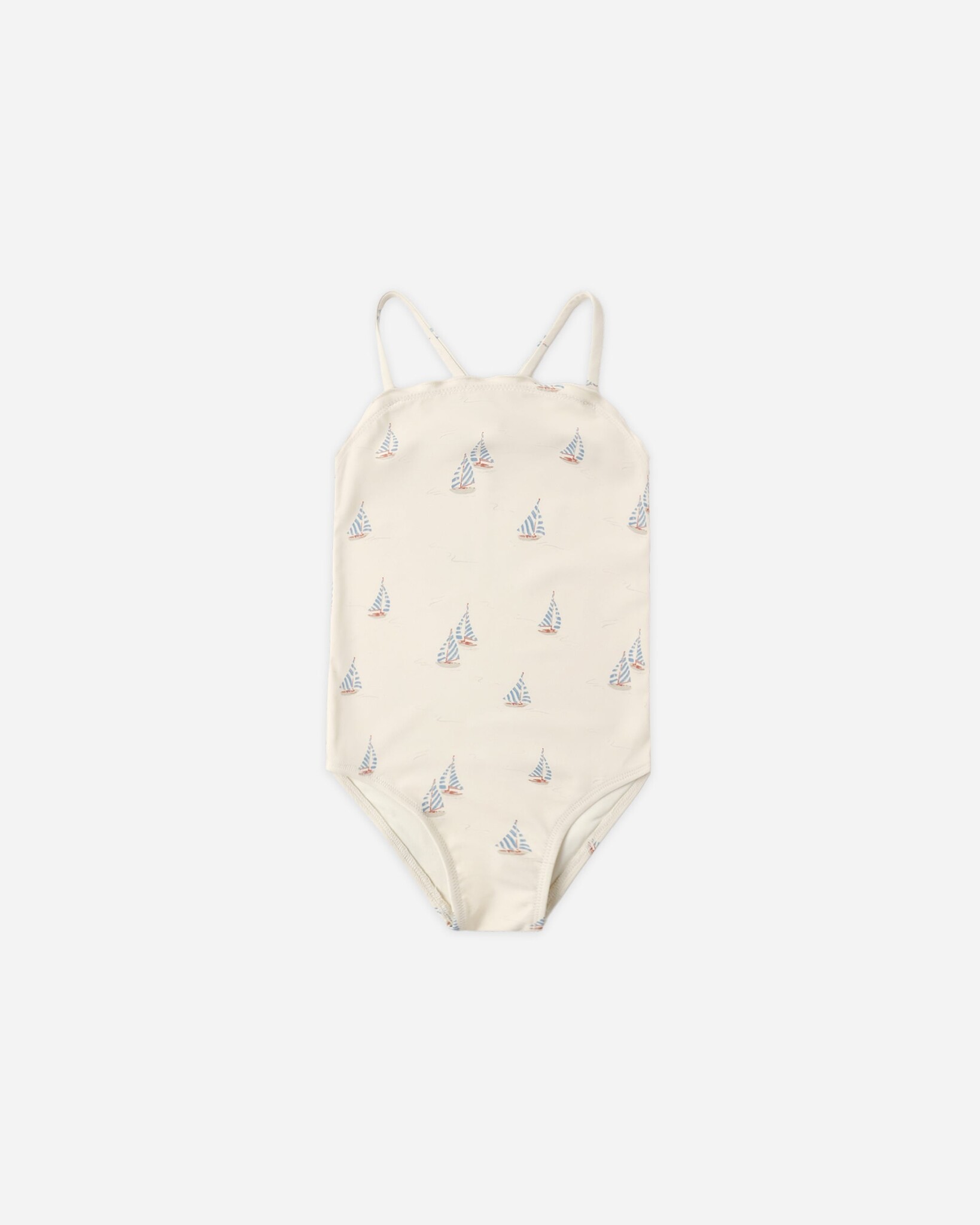 • Maillot une pièce avec volant sur le col et bretelles qui se rejoignent au dos.