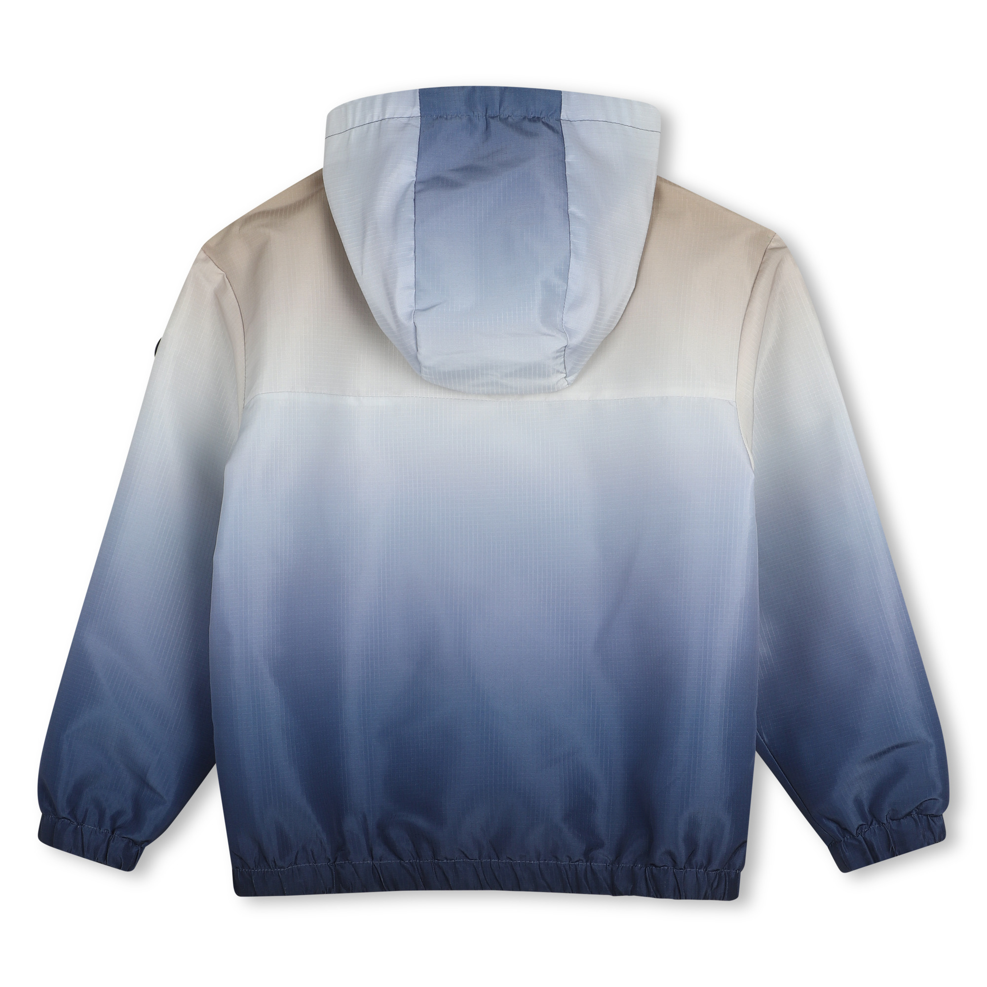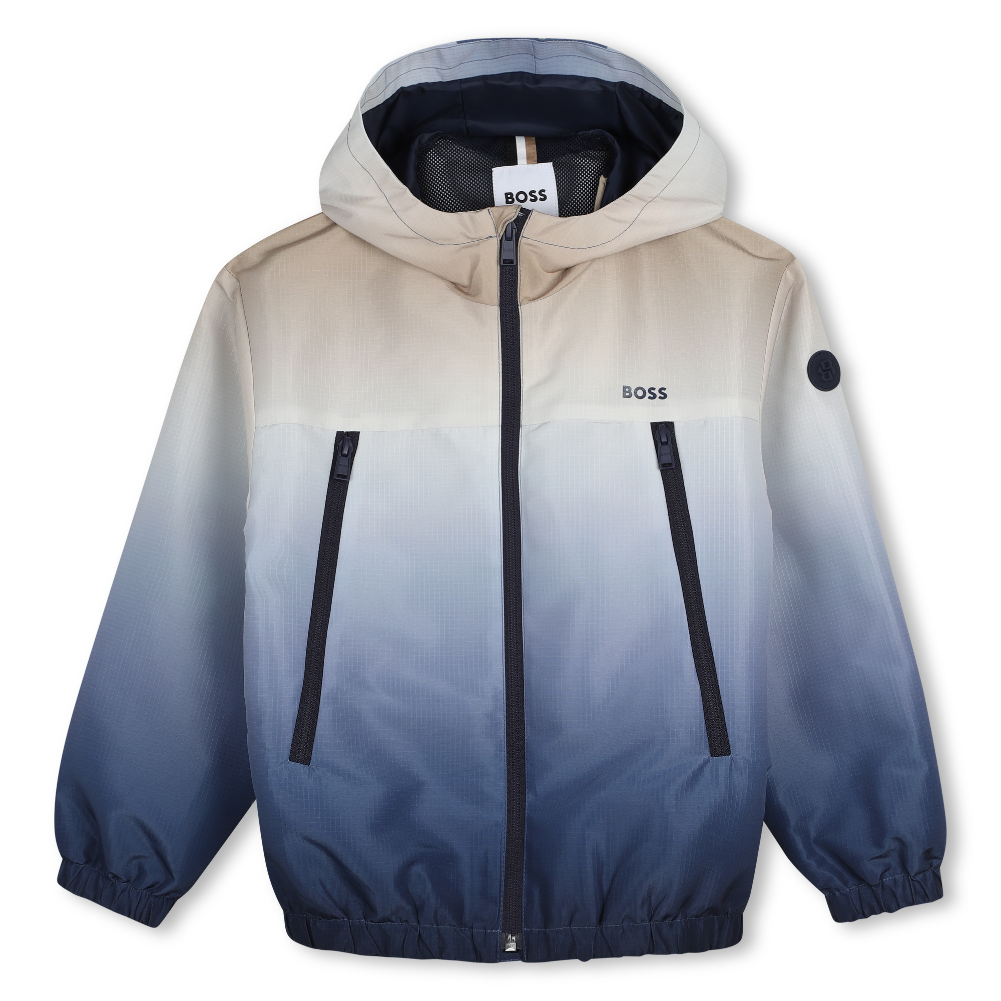 • Imperméable à capuchon et fermeture éclair, dégradé de beige et de bleu.