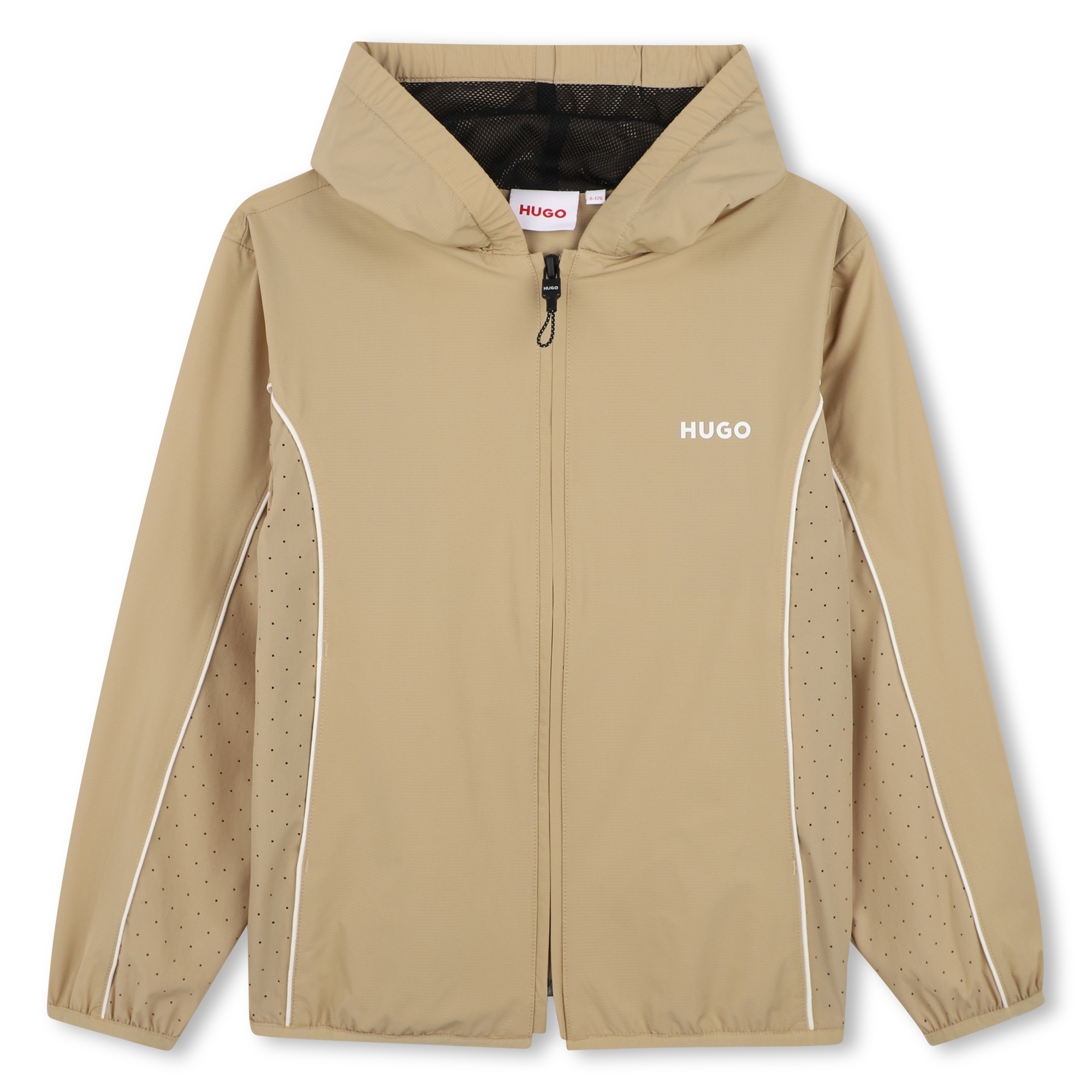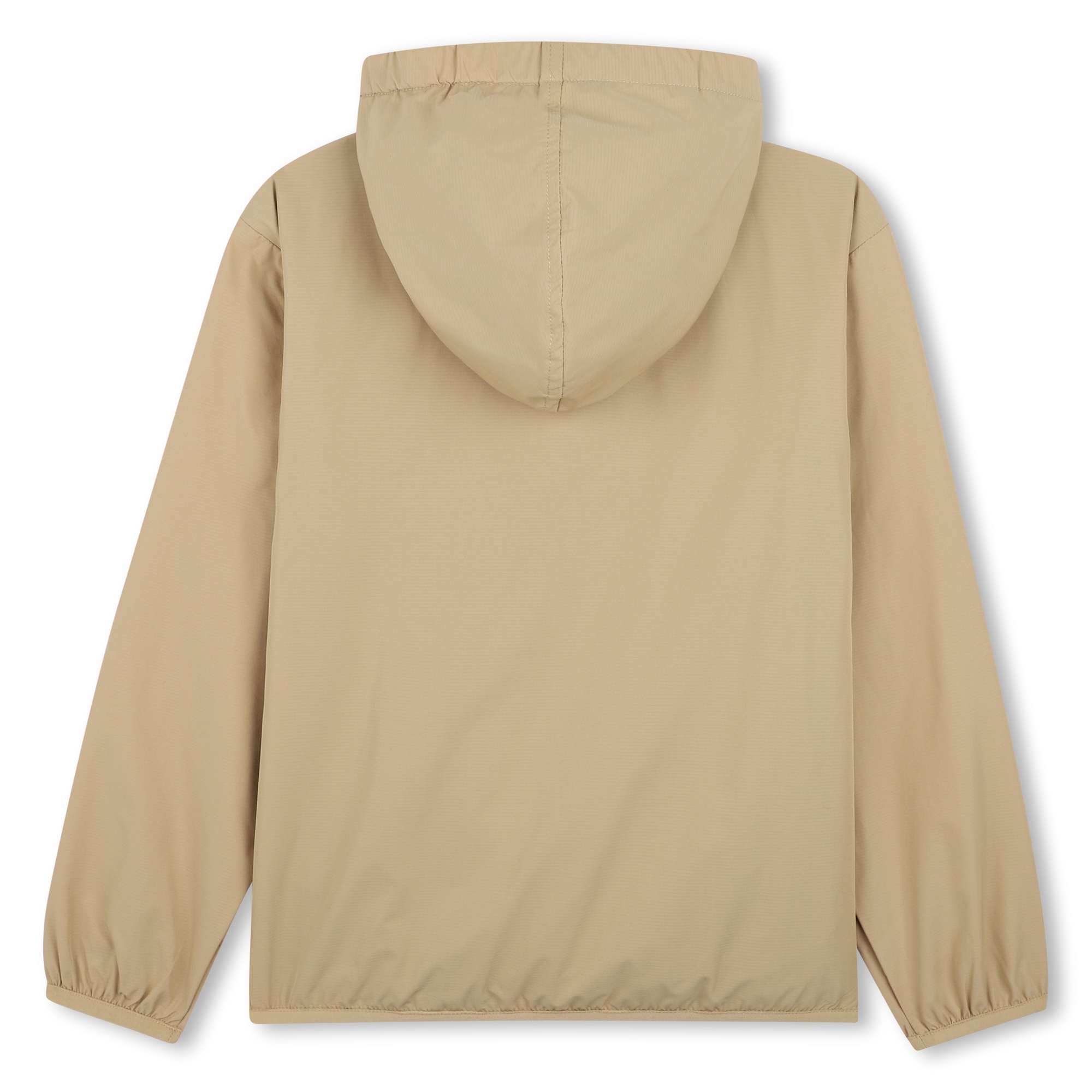 • Manteau léger beige avec capuchon et fermeture éclair. Petits trous sous les manches pour une meilleure respiration du tissu.