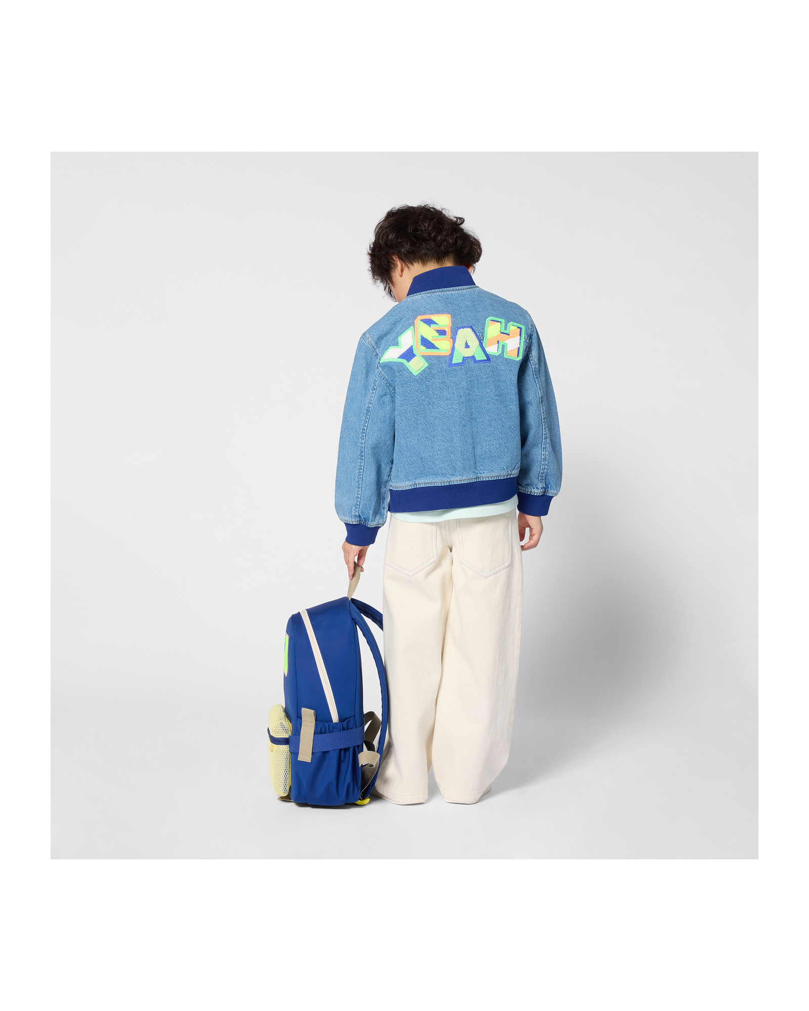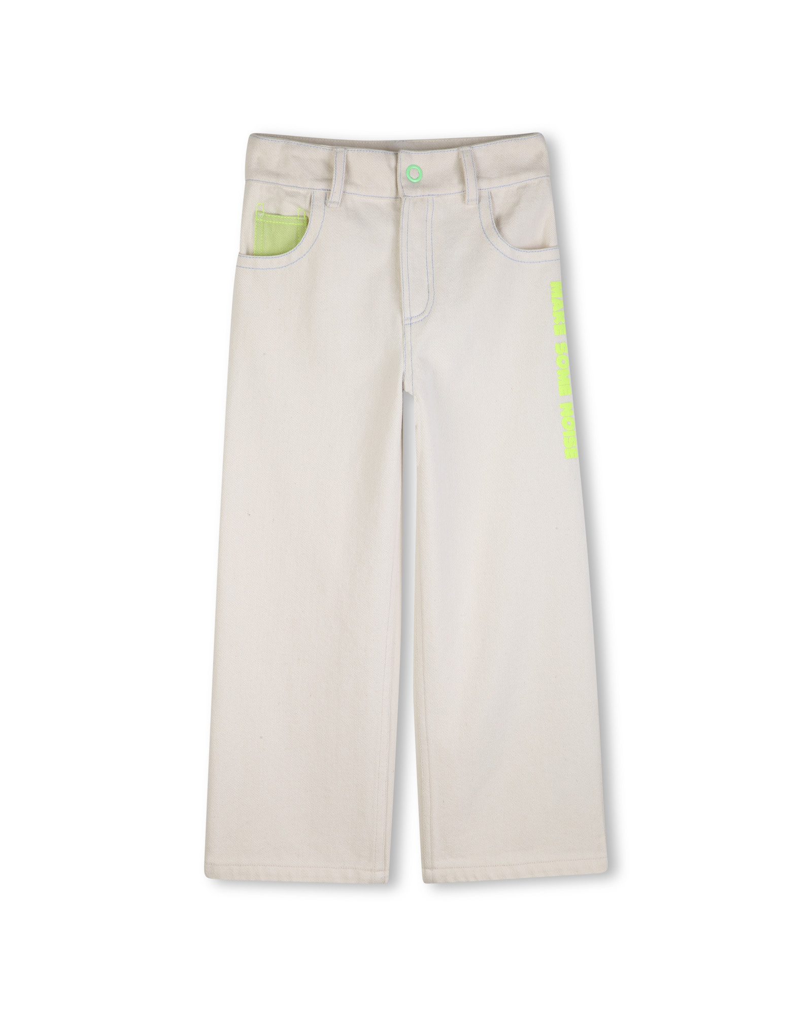 • Pantalon jeans blanc avec petits détails vert néon.