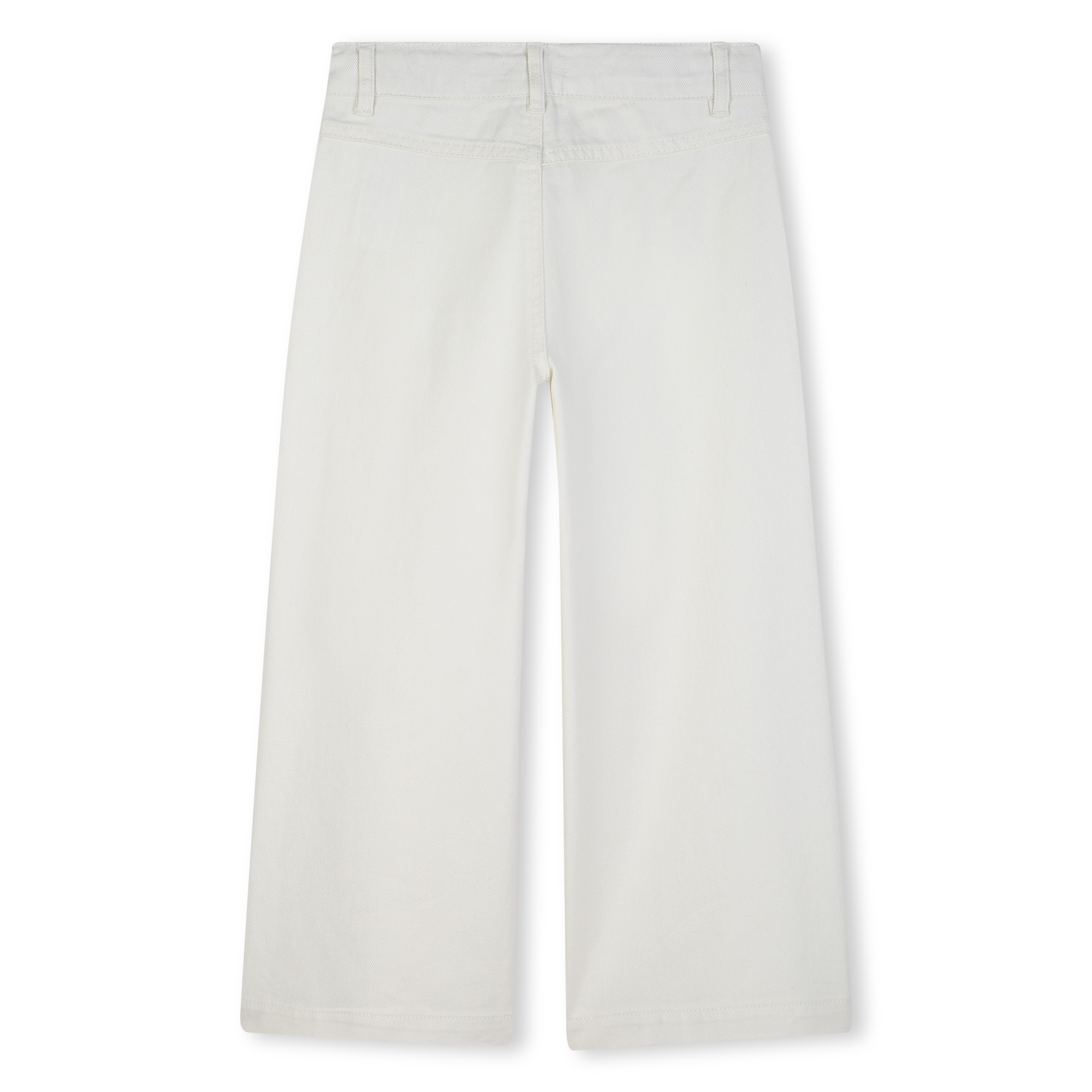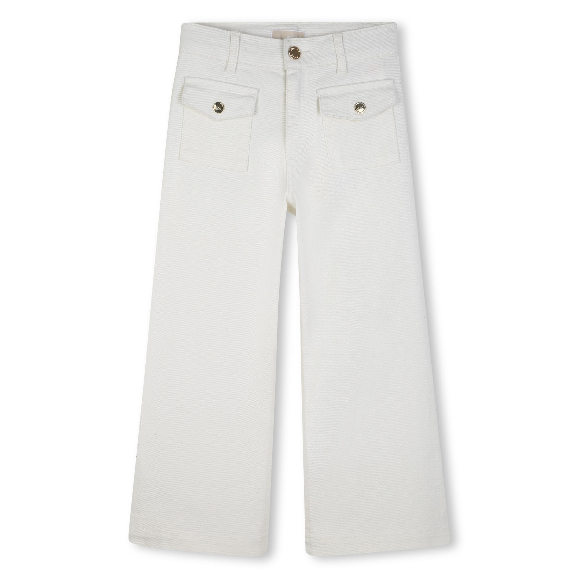 • Pantalon de style jeans blanc à jambe large et pochettes aux boutons dorés à l'avant.