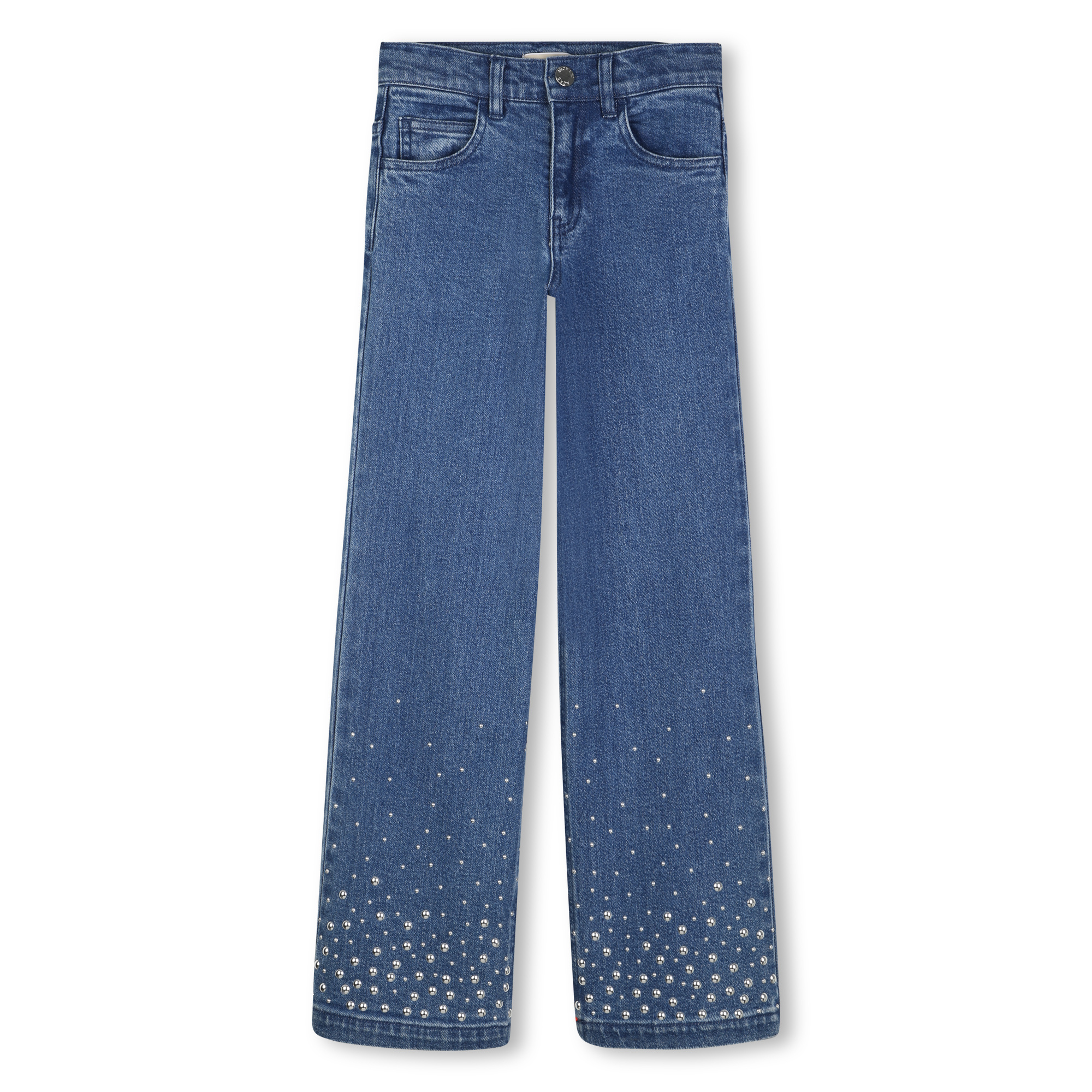 • Jeans bleu classique avec détails argentés cloutés au bas.