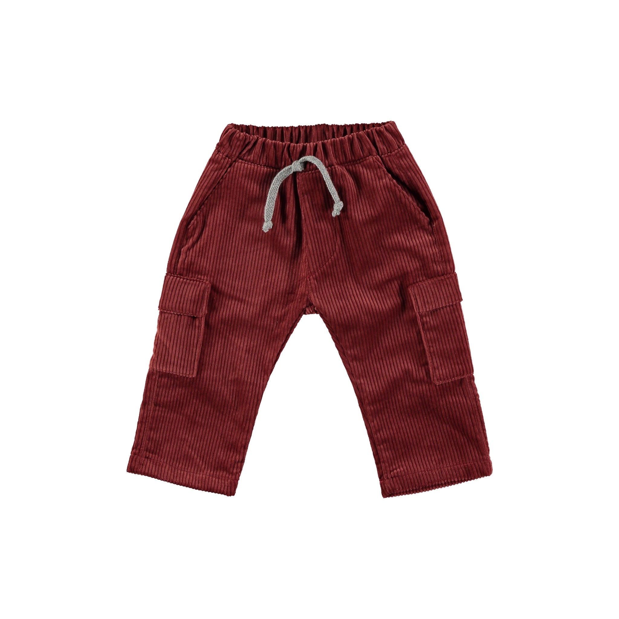 • Pantalon bourgogne en velours côtelé à taille élastique.