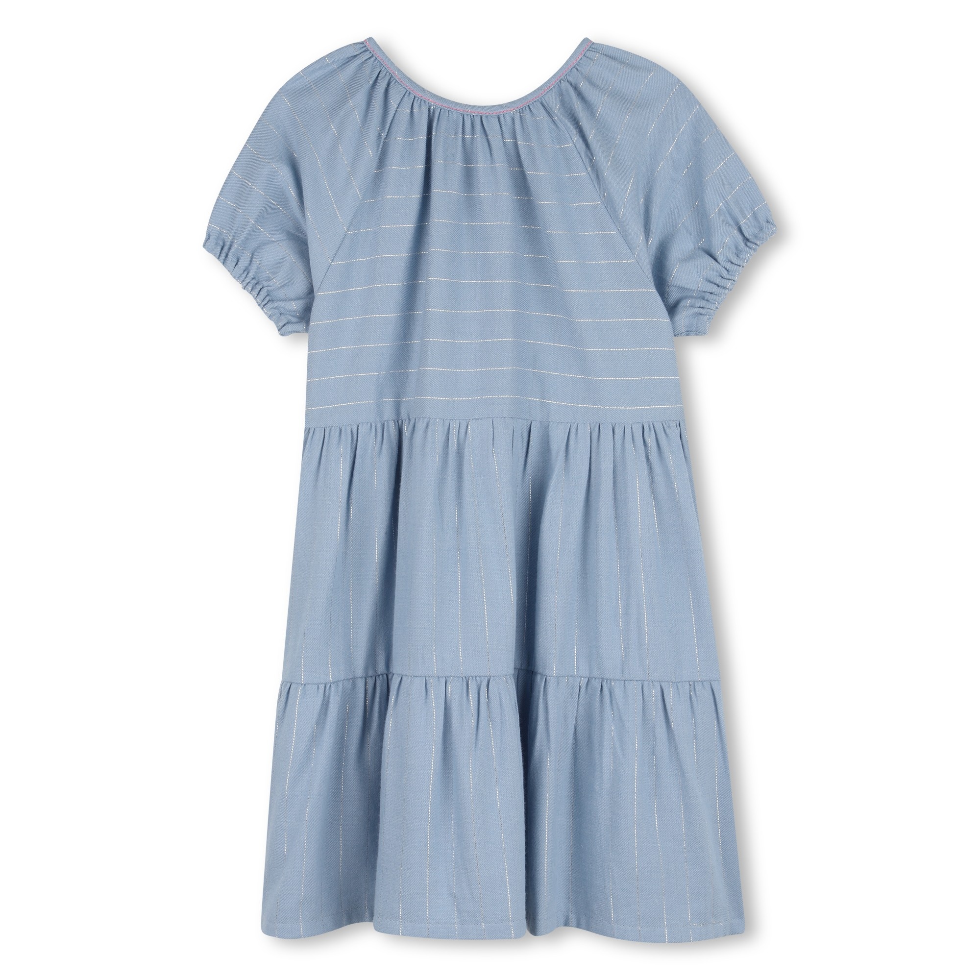 • Robe bleue à boutonnière rose et petits détails de lignes argentées. Manches élastiques.