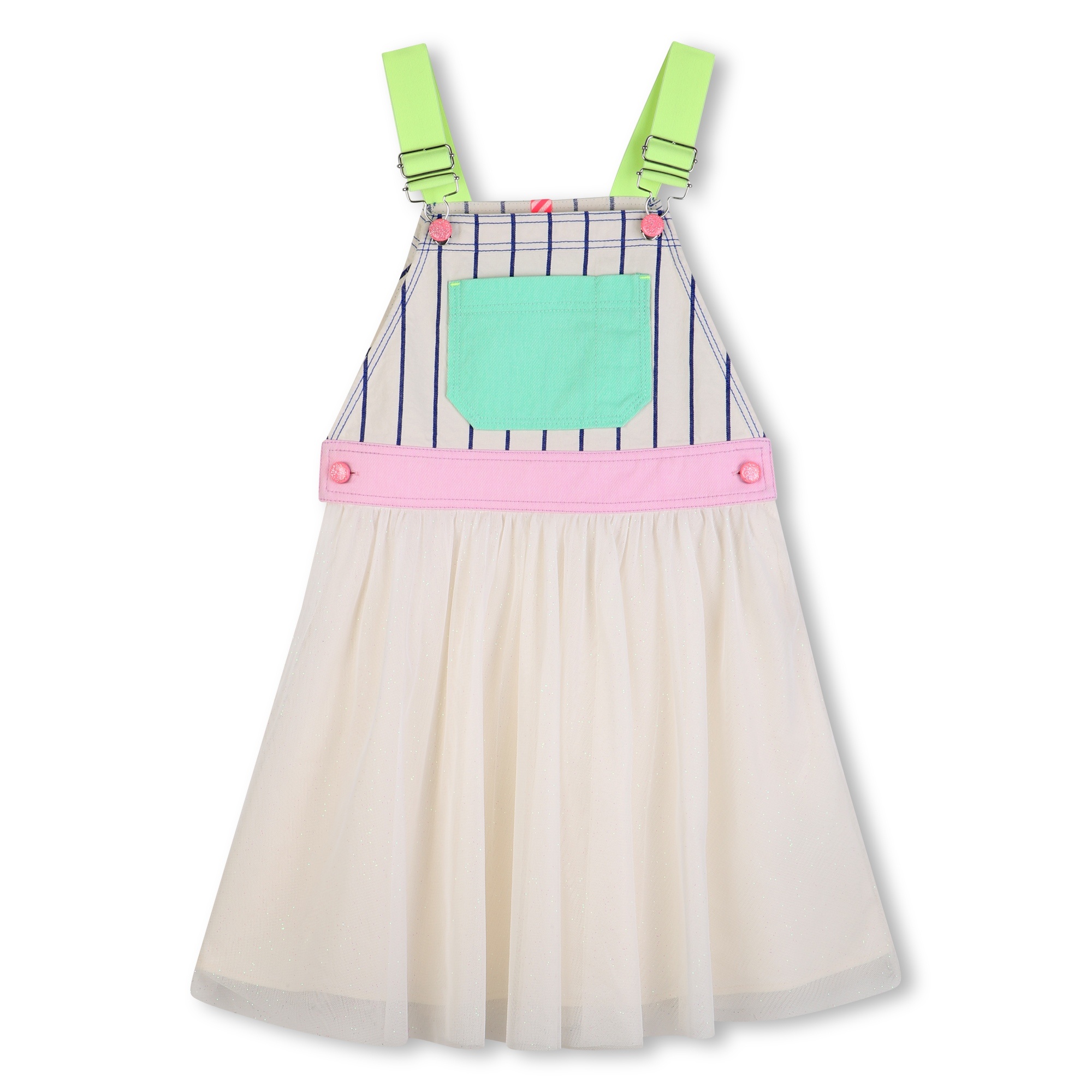 • Robe multi de style salopette avec bretelles ajustables et jupon en tulle blanc brillant.