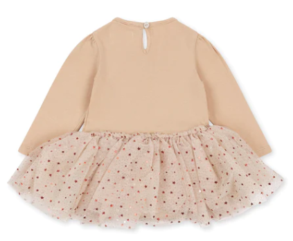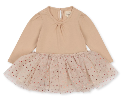 • Robe ballerine souple à manches longues et jupe en tulle à trois couches. Elle se ferme avec un seul bouton en nacre dans le dos. La robe est munie de boutons-pression aux jambes pour faciliter l'habillage.