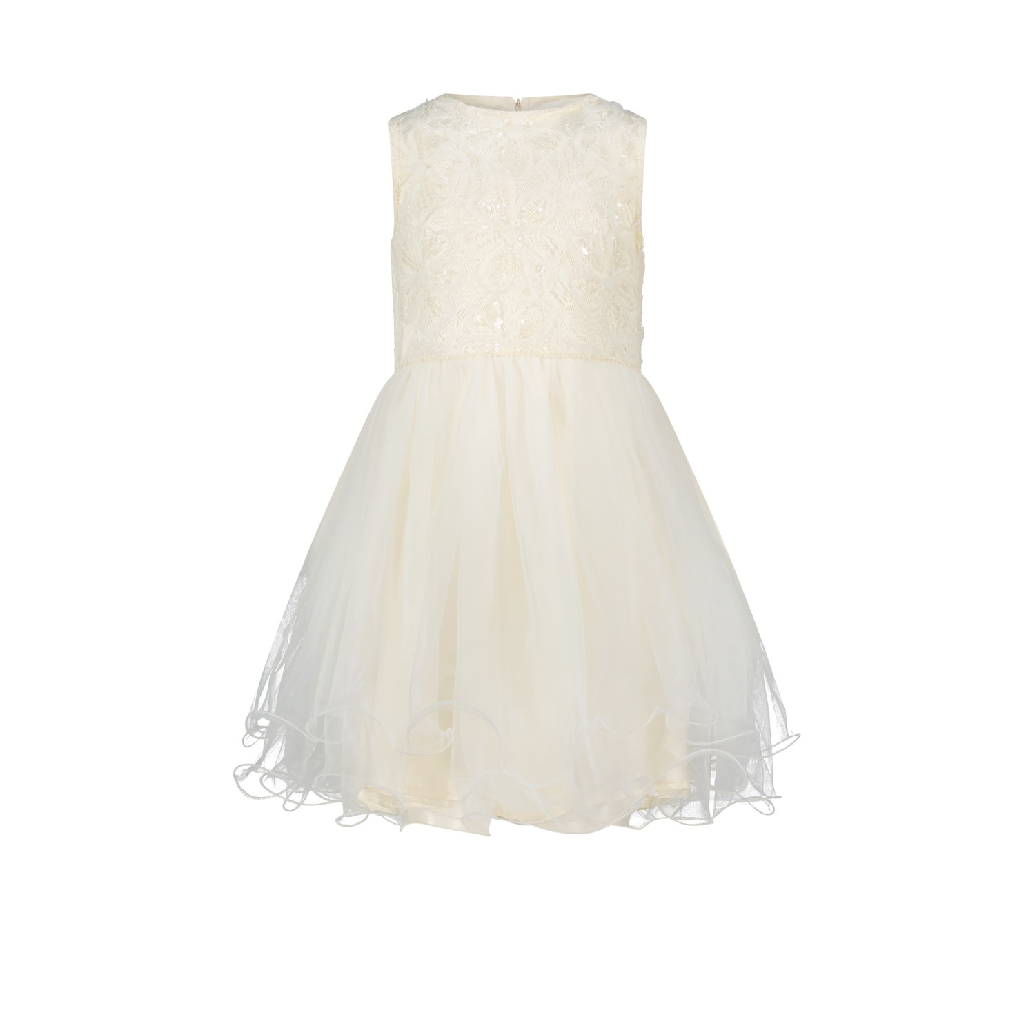 • Robe sans manches pour filles avec jupe évasée et haut en dentelle contrastée. Avec un ruban à la taille et une fermeture zippée au dos.