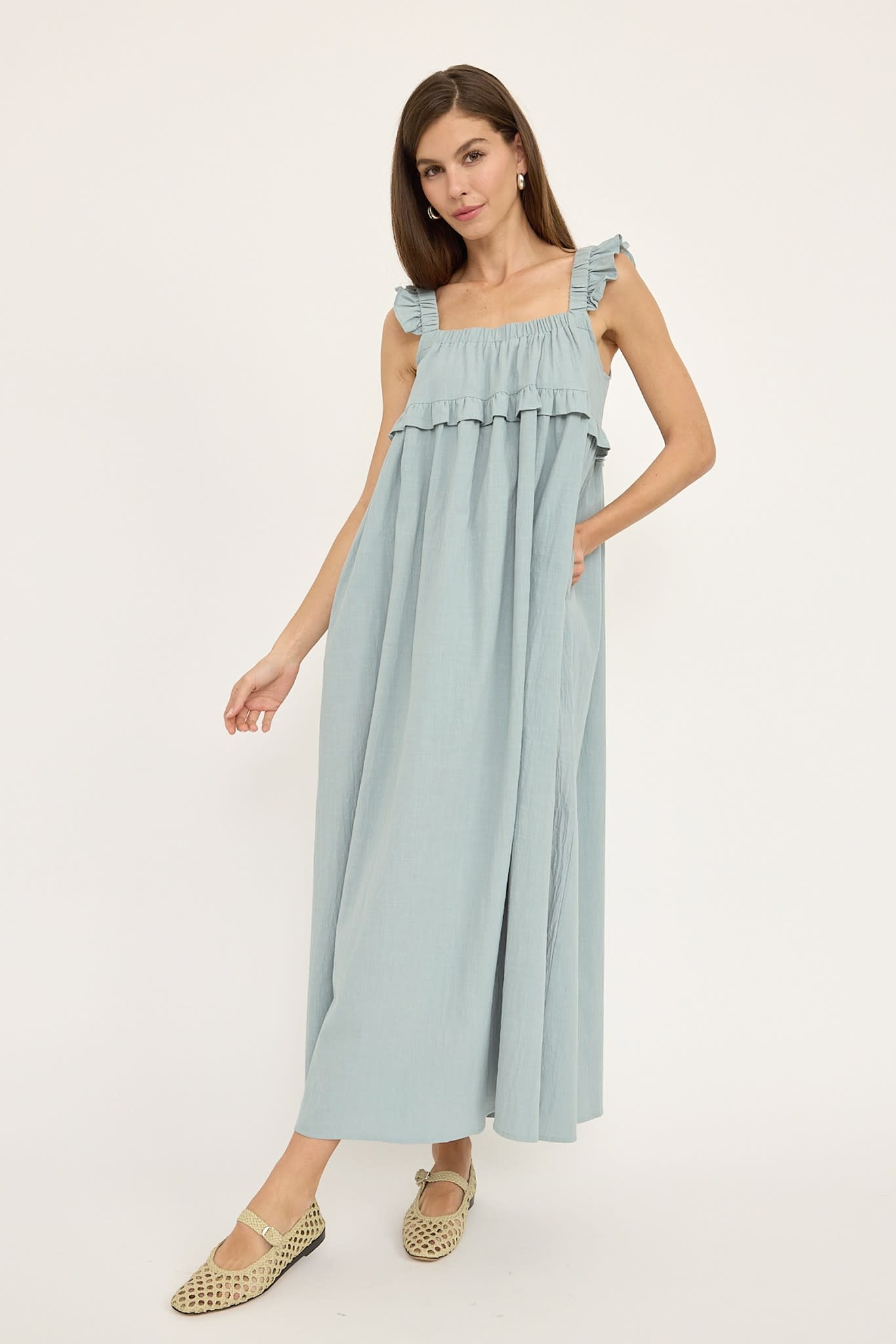 • Robe longue avec bretelles à volants ainsi que des poches latérales.