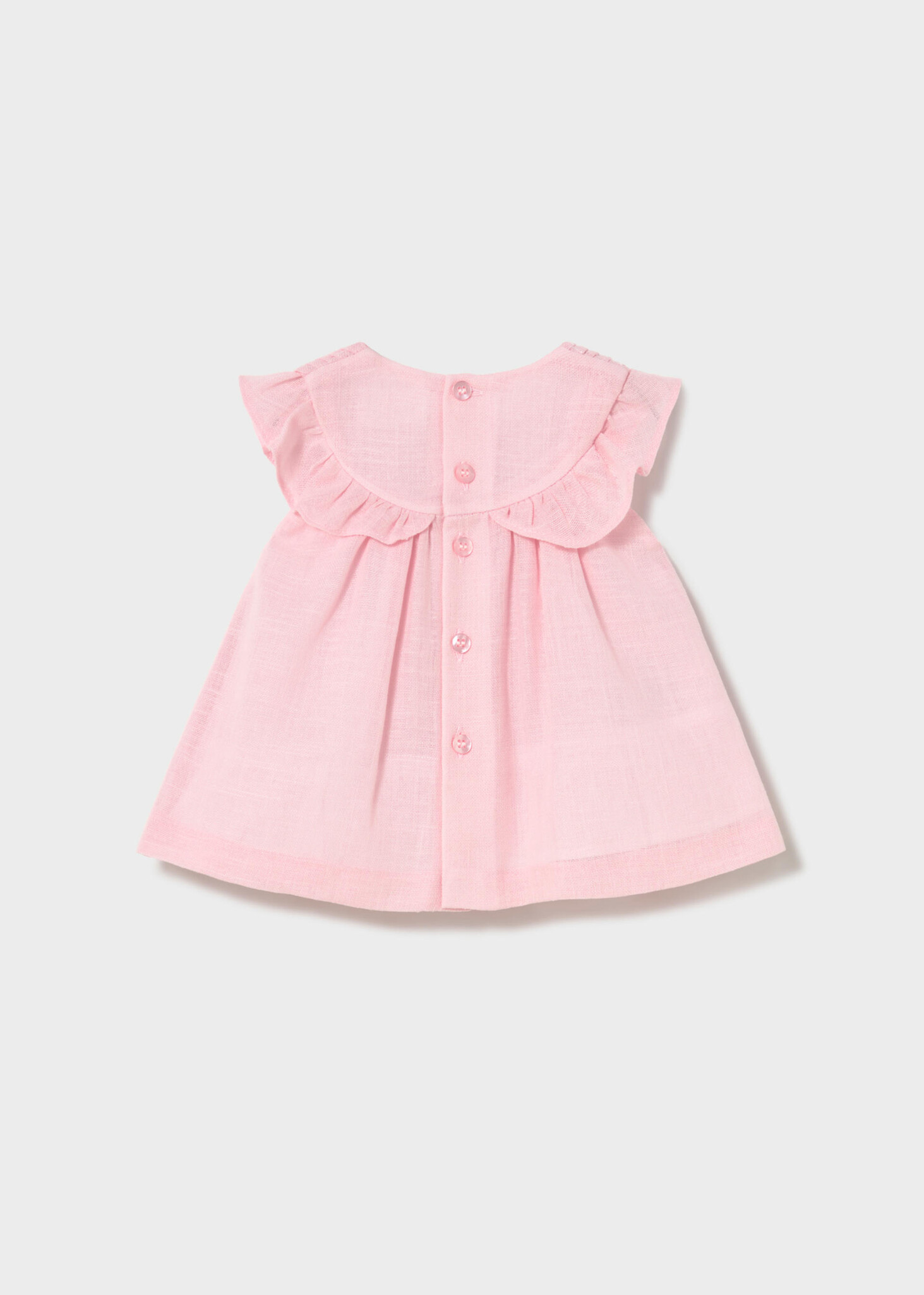 • Robe manches courtes de couleur rose boutonnée au dos.