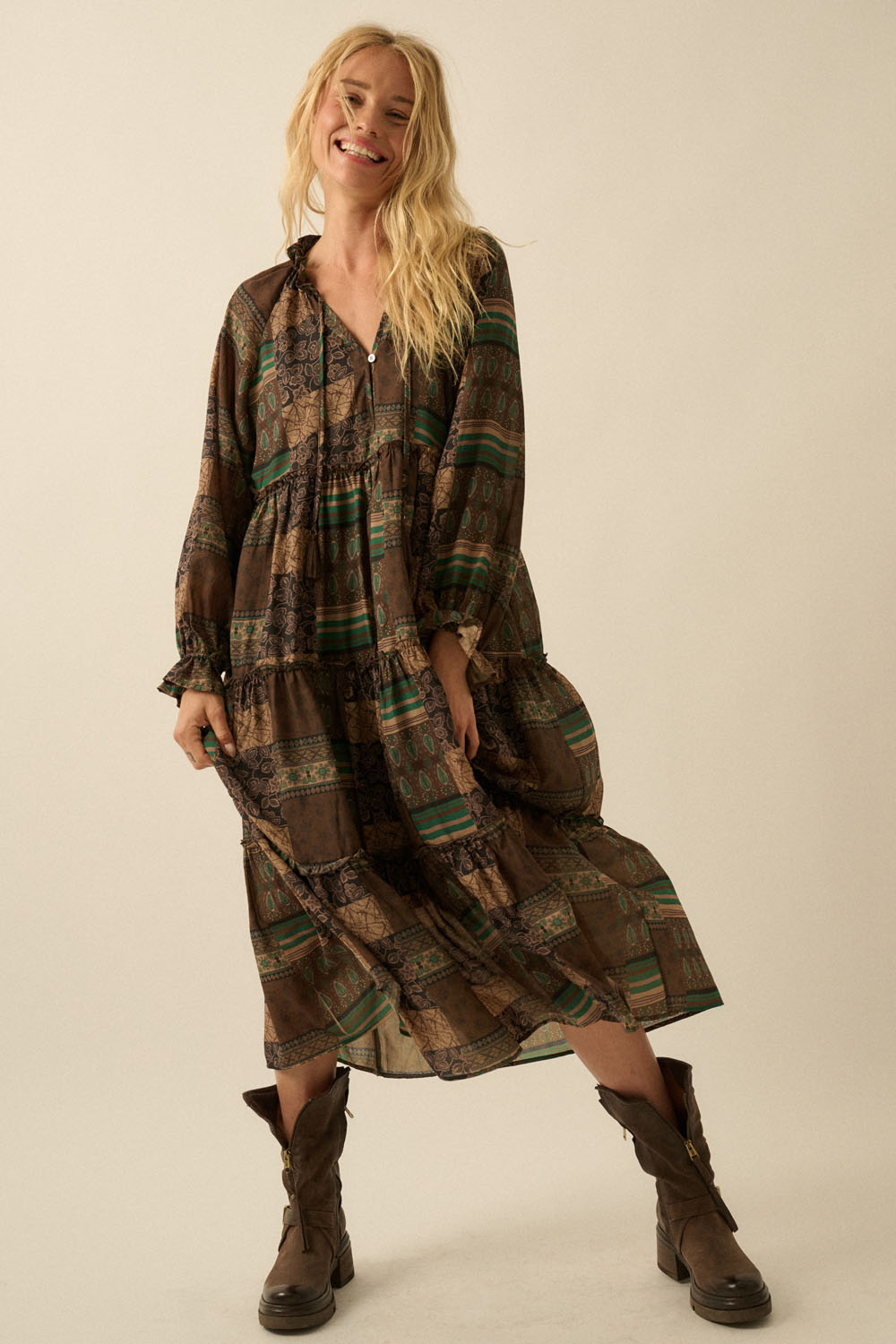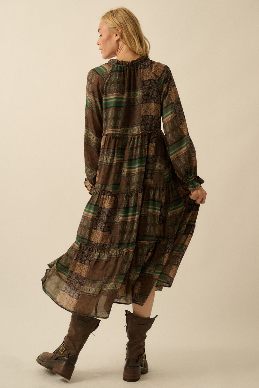 • Robe manches longues de couleur chocolat à imprimé patchwork.