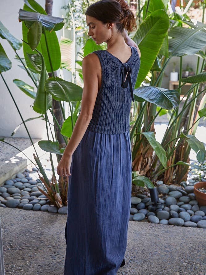 • Robe midi évasée sans manches avec col rond et détail d lien noué au dos.