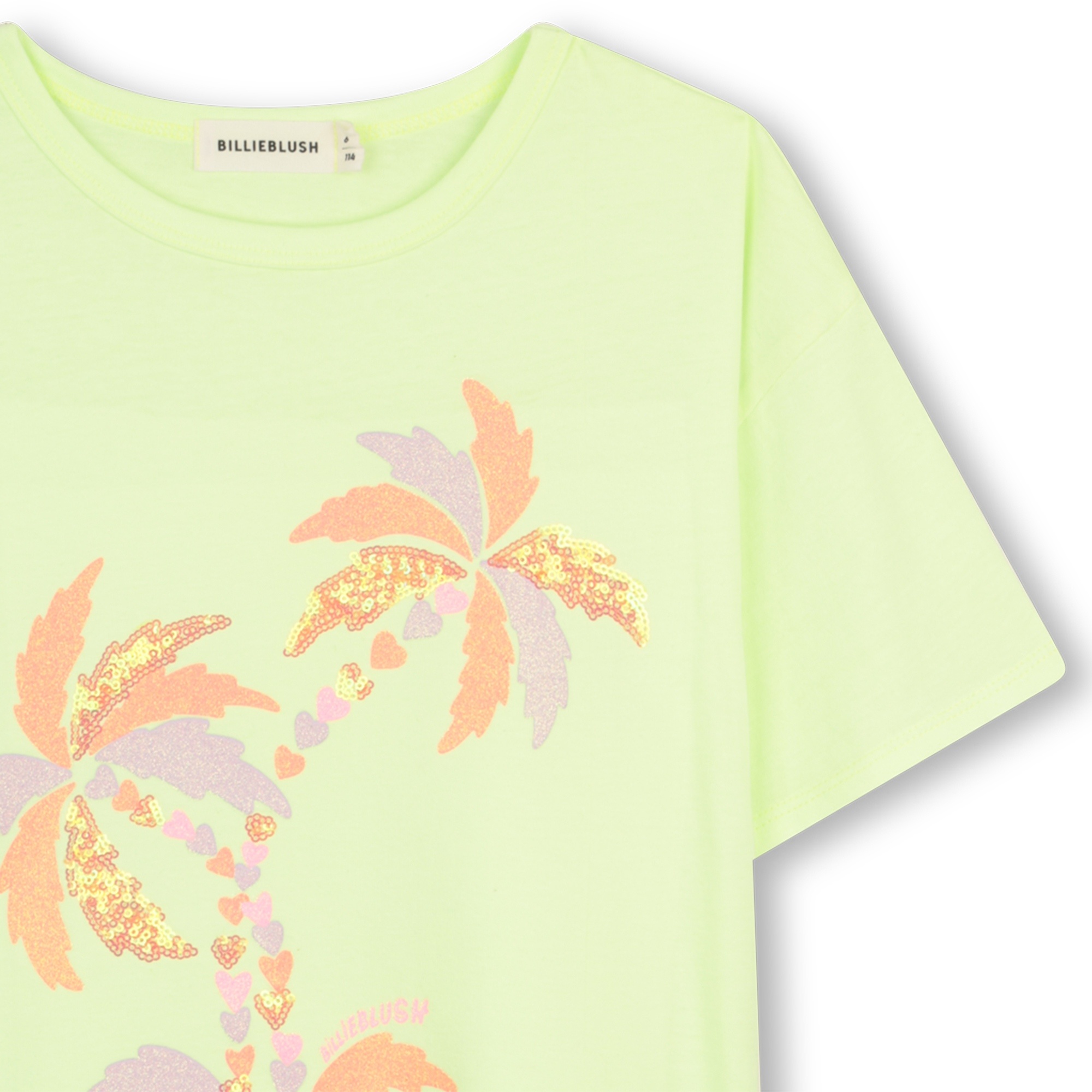 • Robe jaune-lime avec imprimé palmiers colorés et à paillettes.