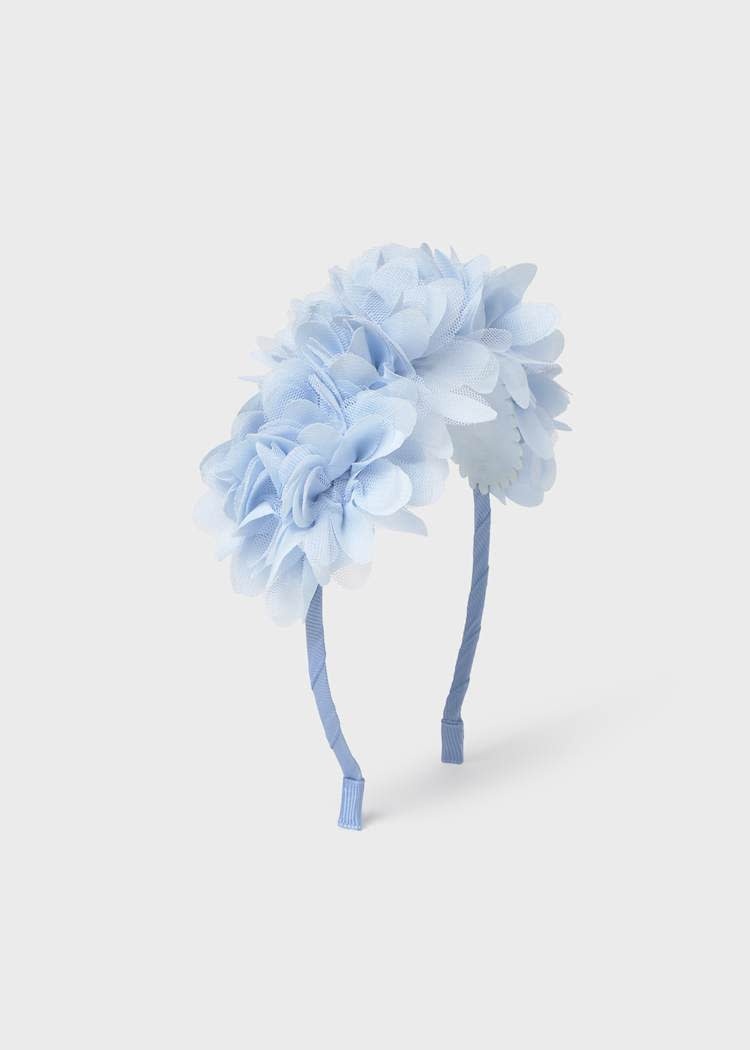 • Serre-tête de couleur bleu ciel avec fleurs en tulle.