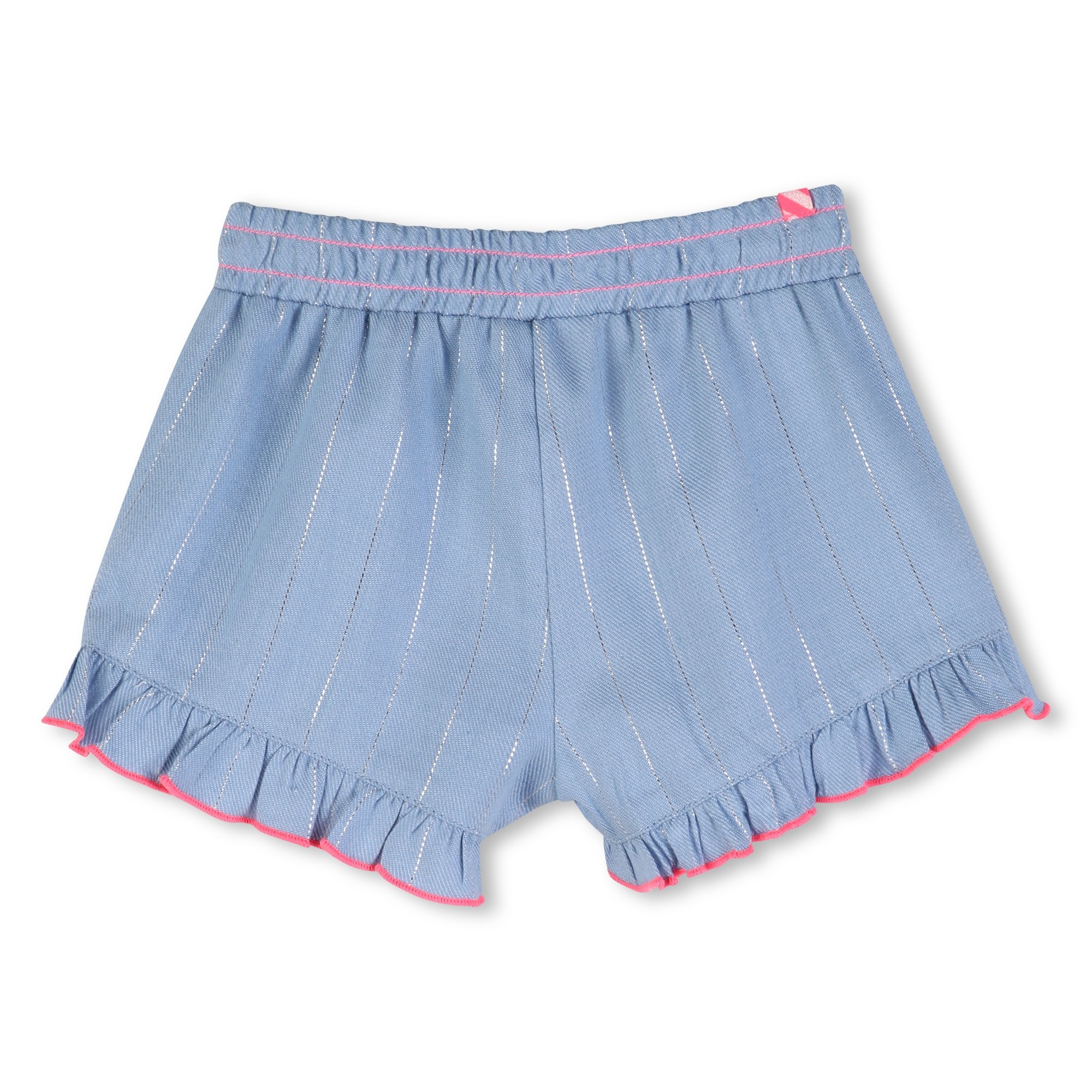 • Short bleu aux détails argentés et roses avec tissu frisé dans le bas. Taille élastique.