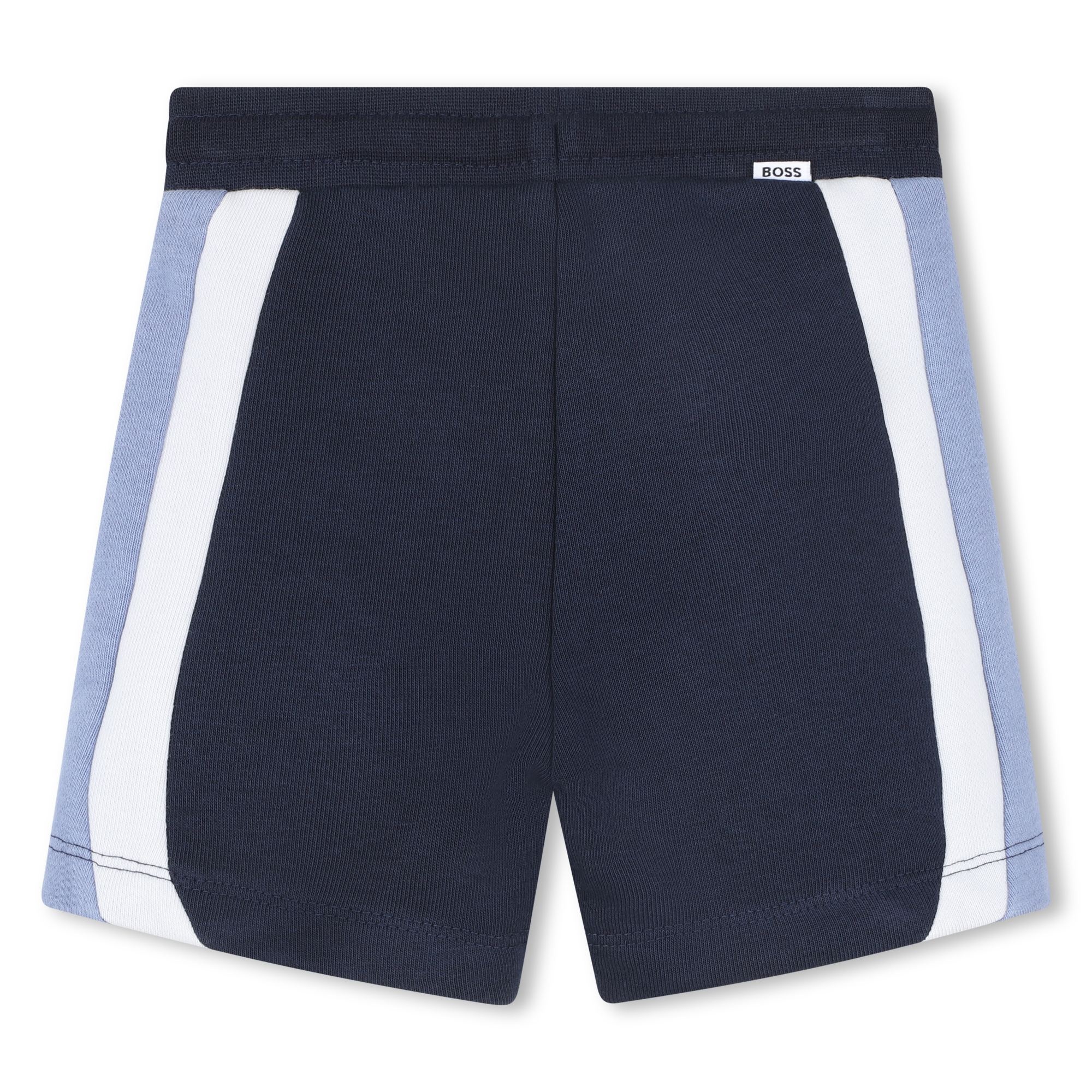 • Short marine rayé bleu et blanc sur les côtés. Petites poches et cordons à l'avant.