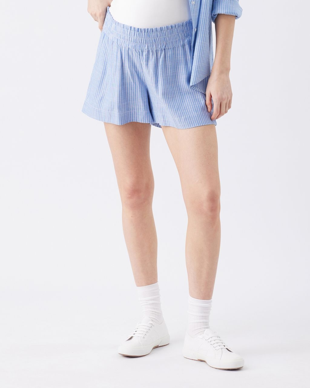 • Shorts rayé bleu et blanc avec élastique large à la taille.
