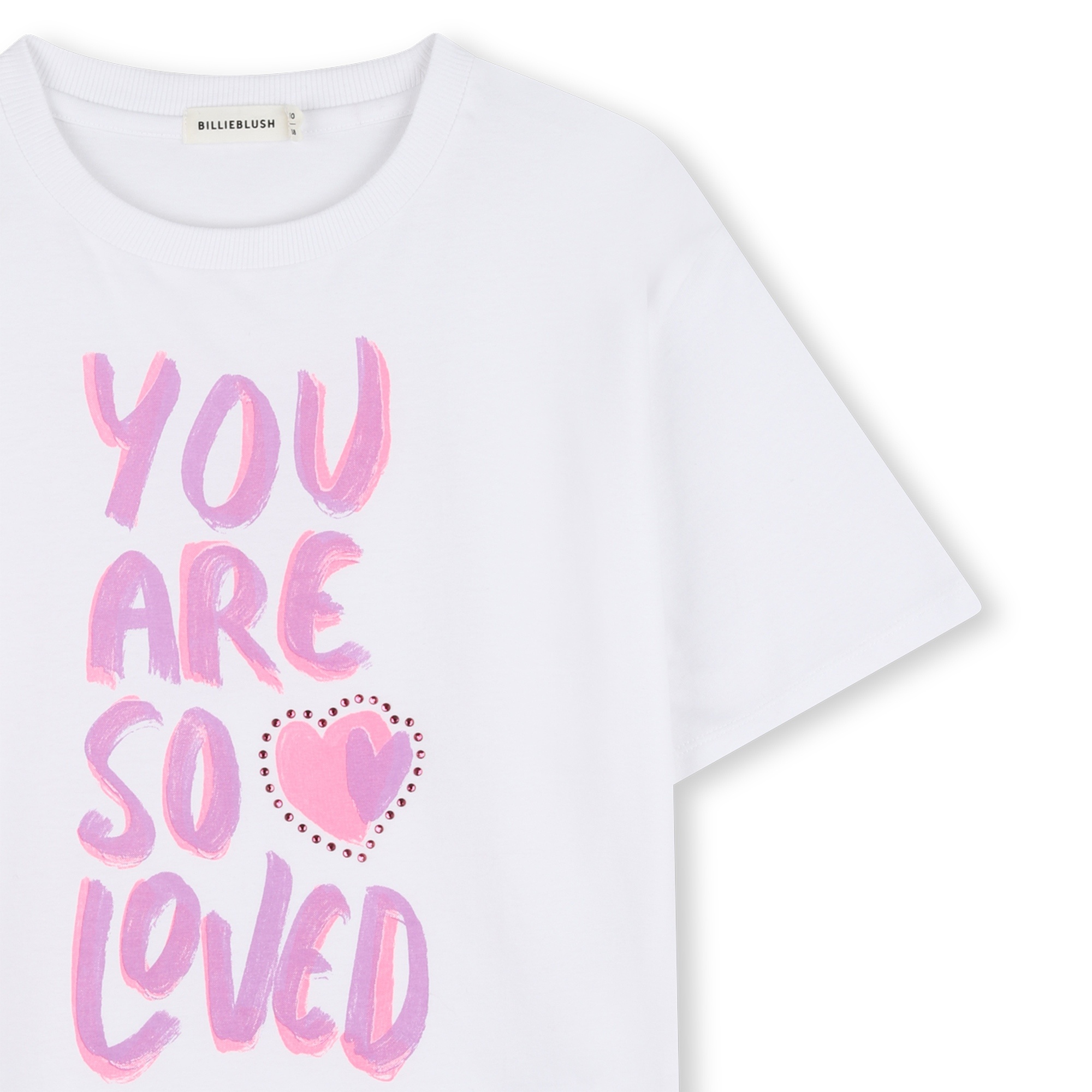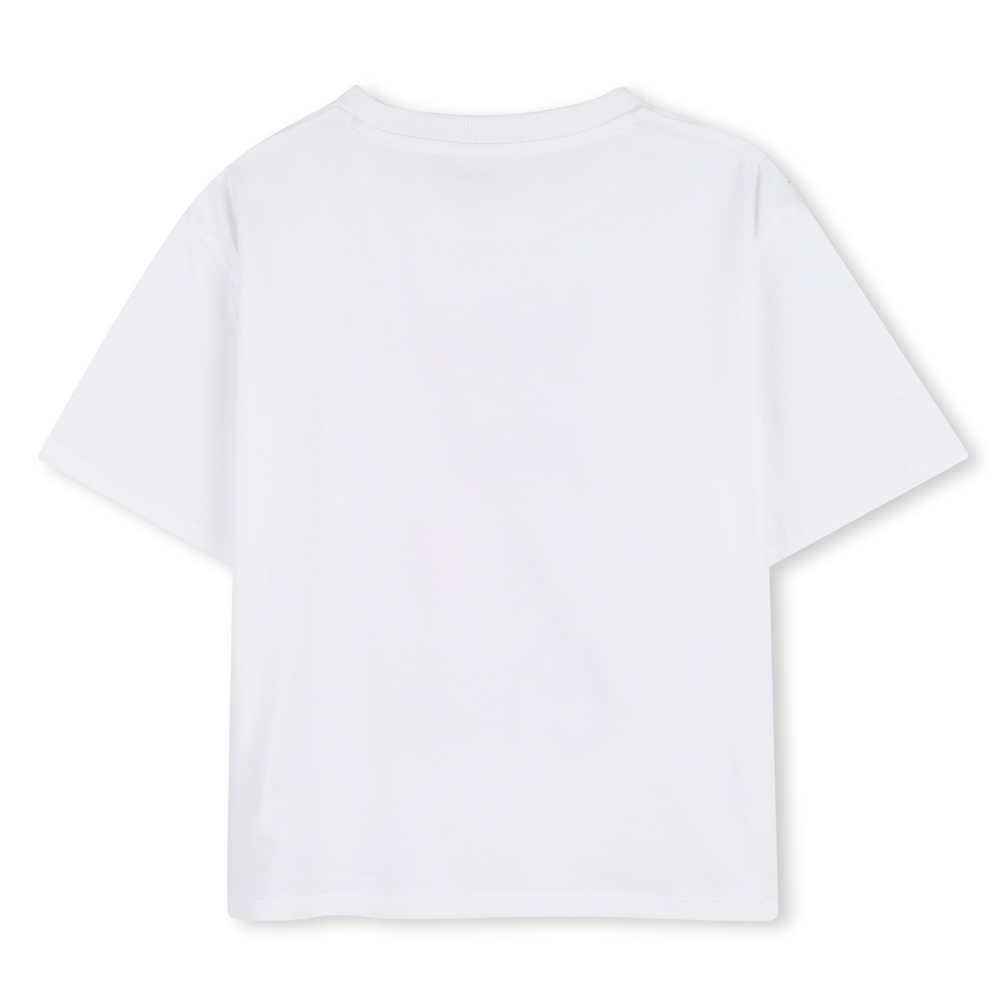 • T-Shirt blanc avec imprimé rose et mauve à l'avant.