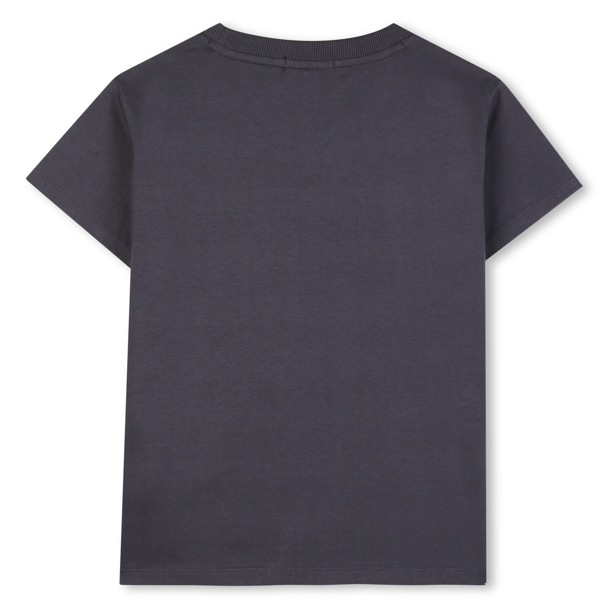 • T-Shirt gris foncé avec imprimé bleu et rose.