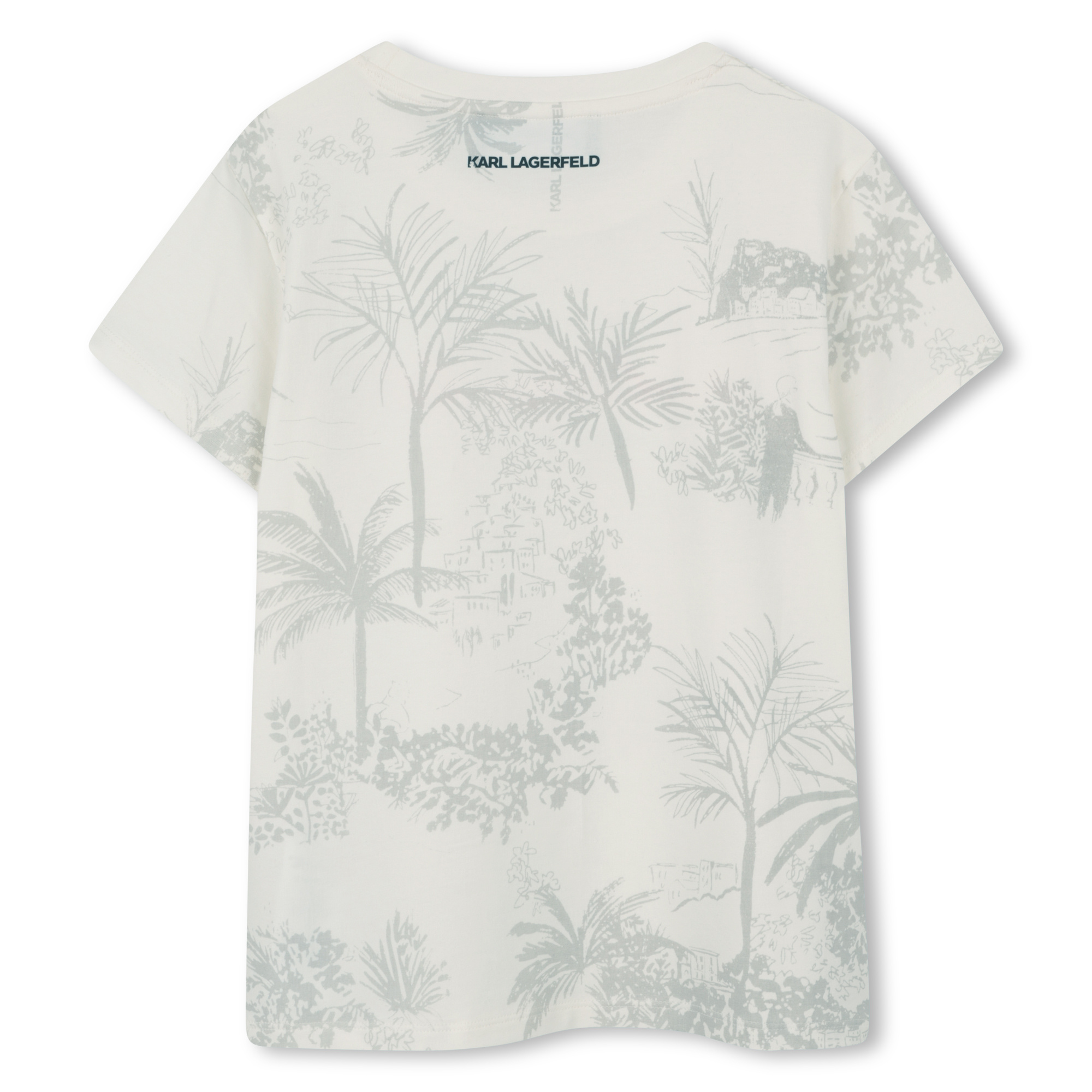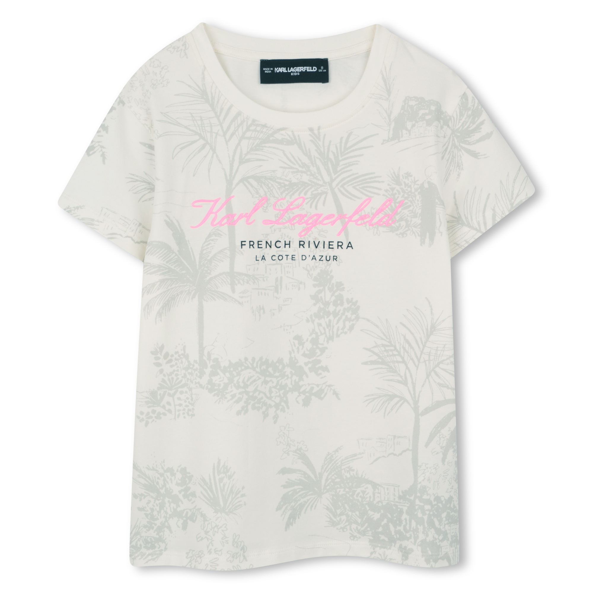 • T-Shirt blanc à imprimé palmier gris et écriture rose en relief.