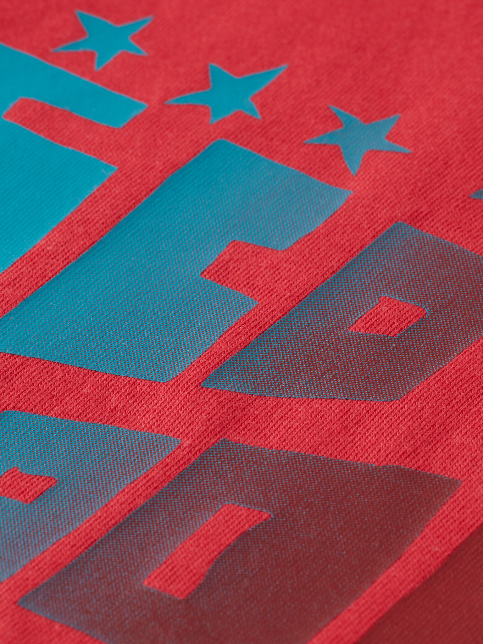 • T-shirt rouge avec écriture dégradant du bleu au rouge.