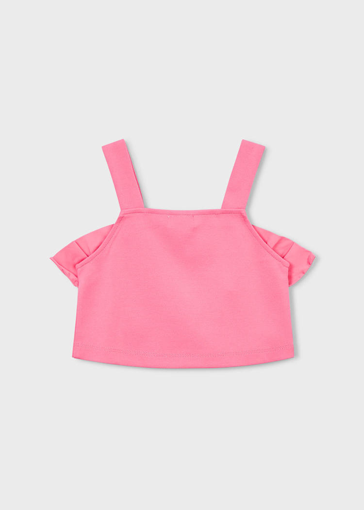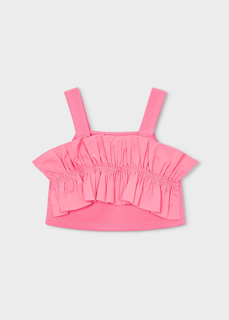 • Haut court à volants de couleur rose.