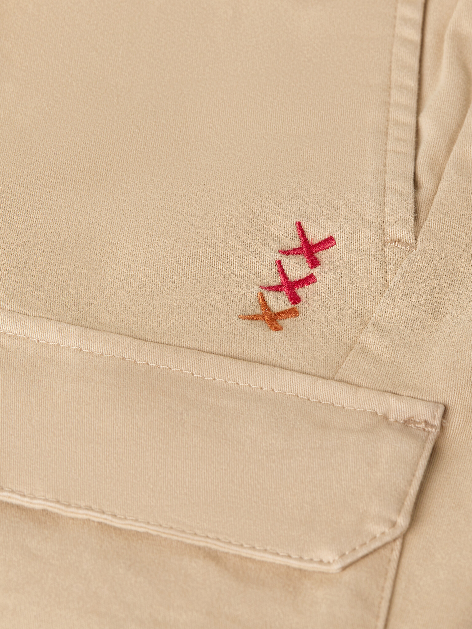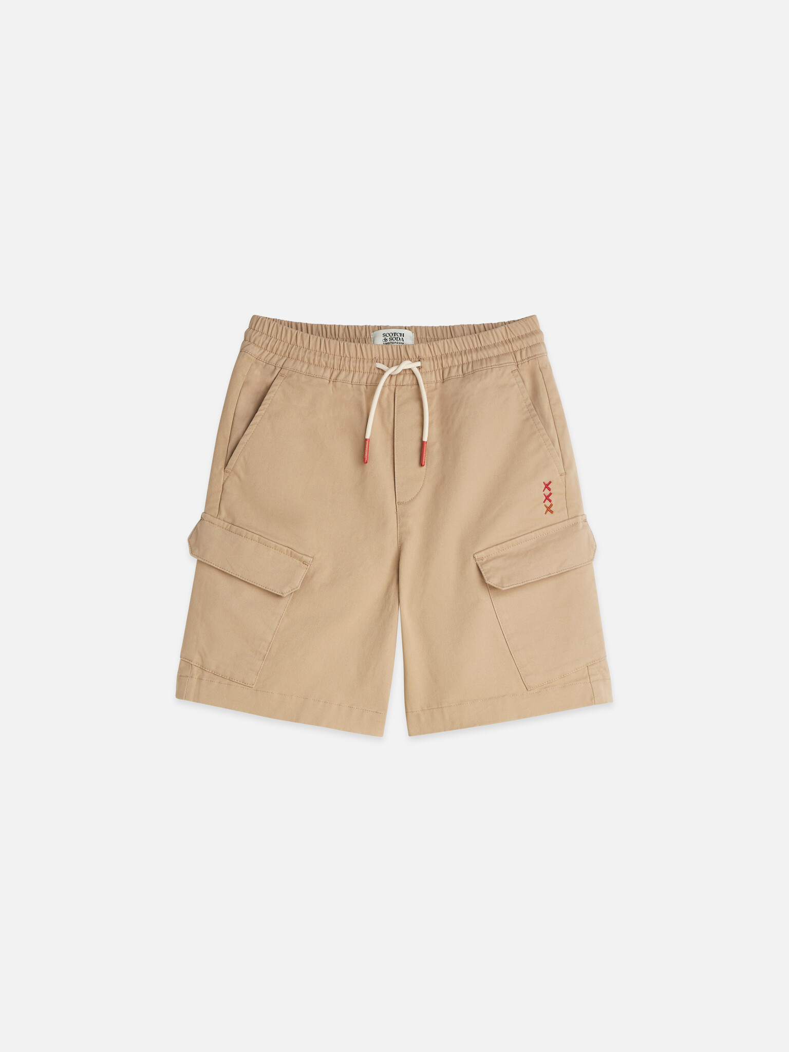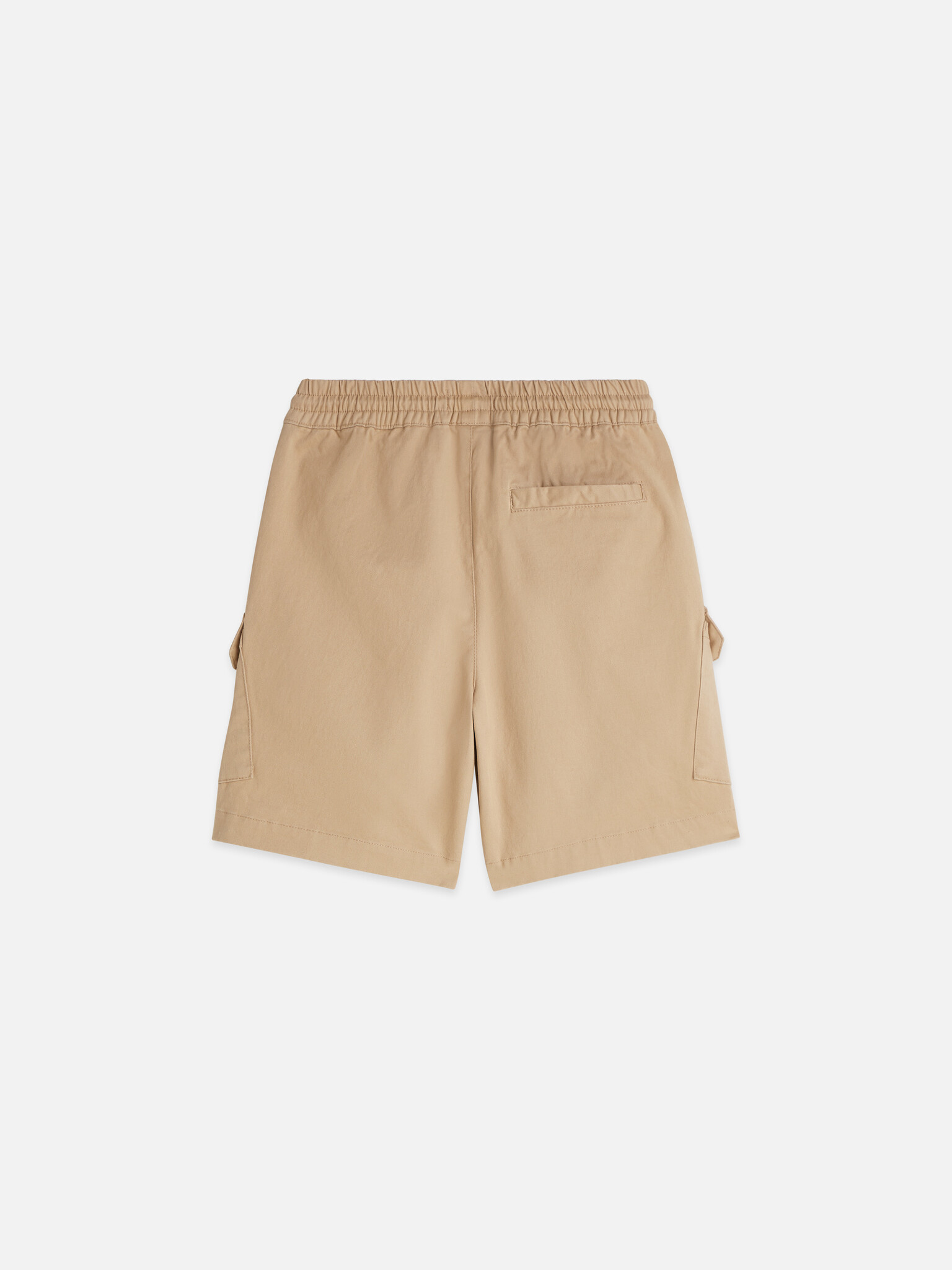 • Beige Bermuda shorts with a resealable pocket and white drawstrings.