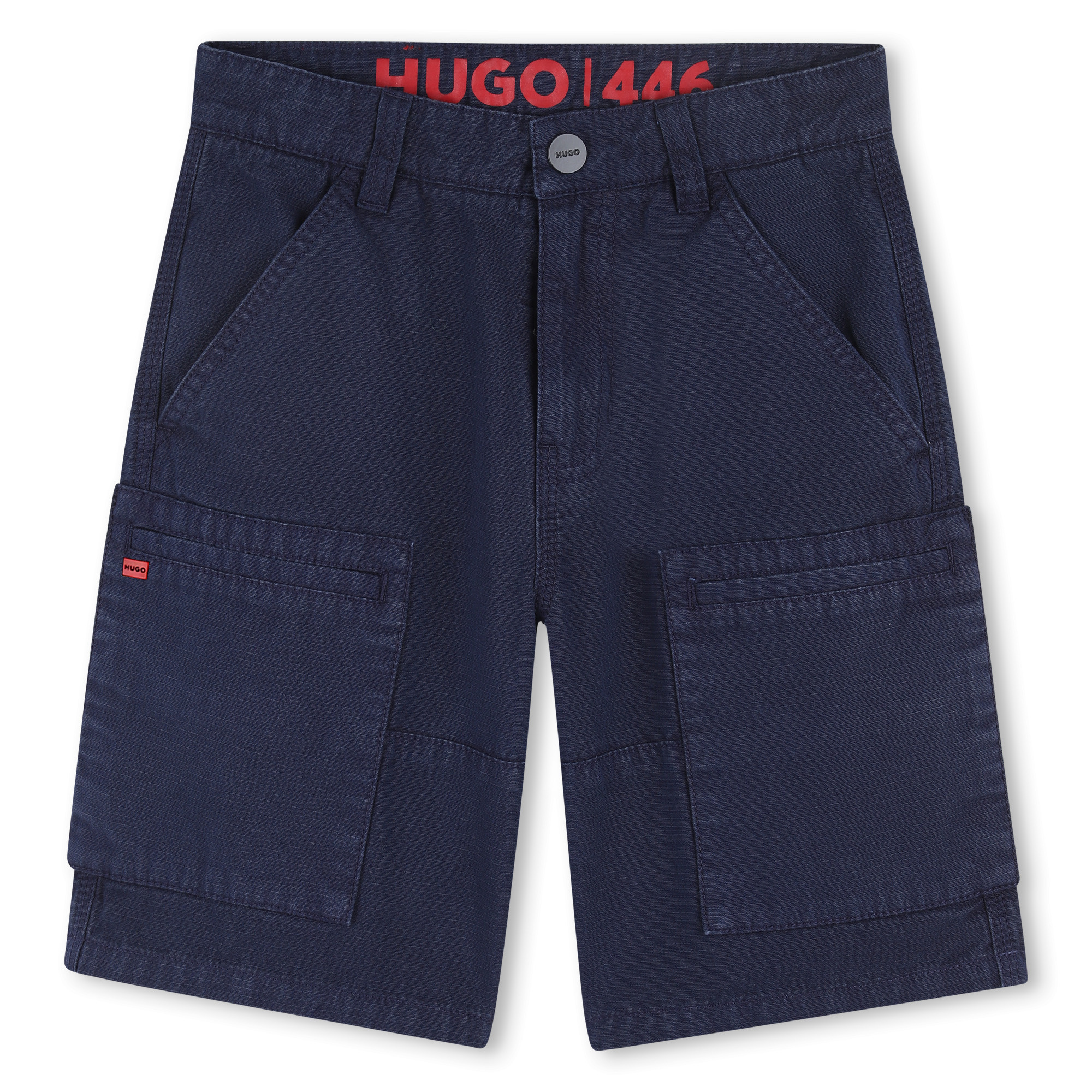 • Navy blue Bermuda shorts with pockets and small red details.