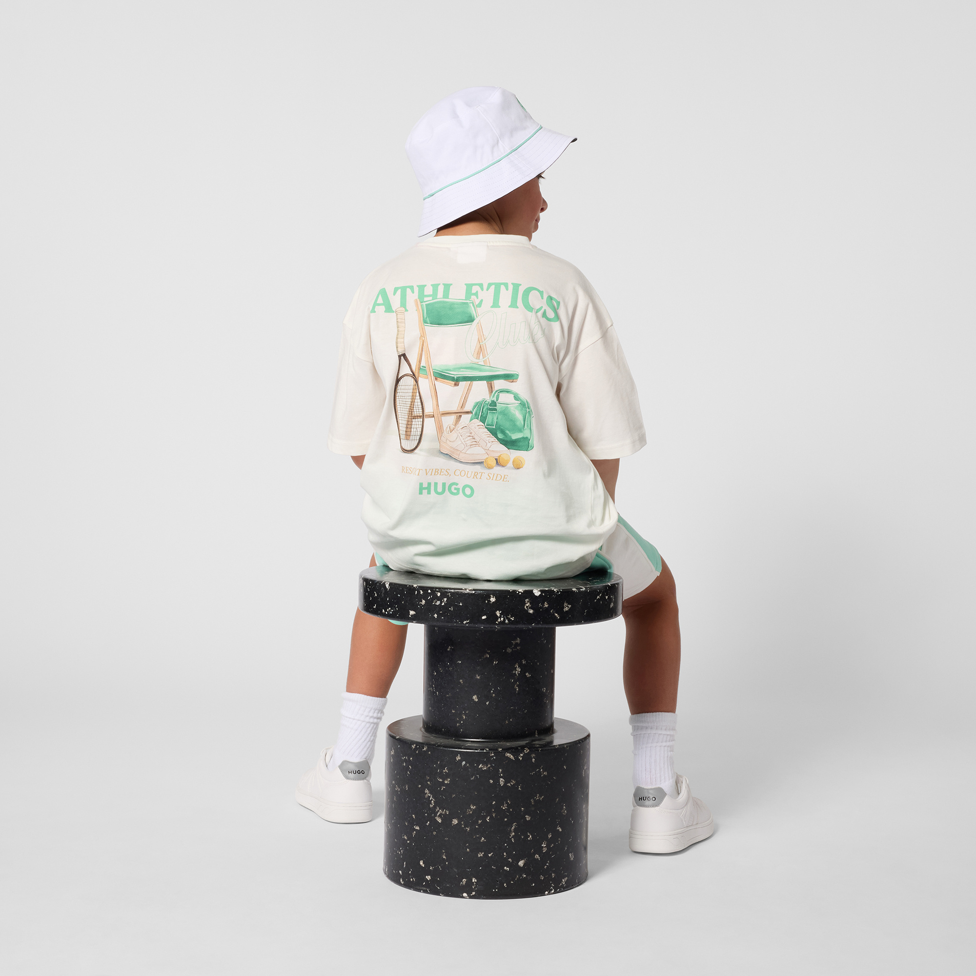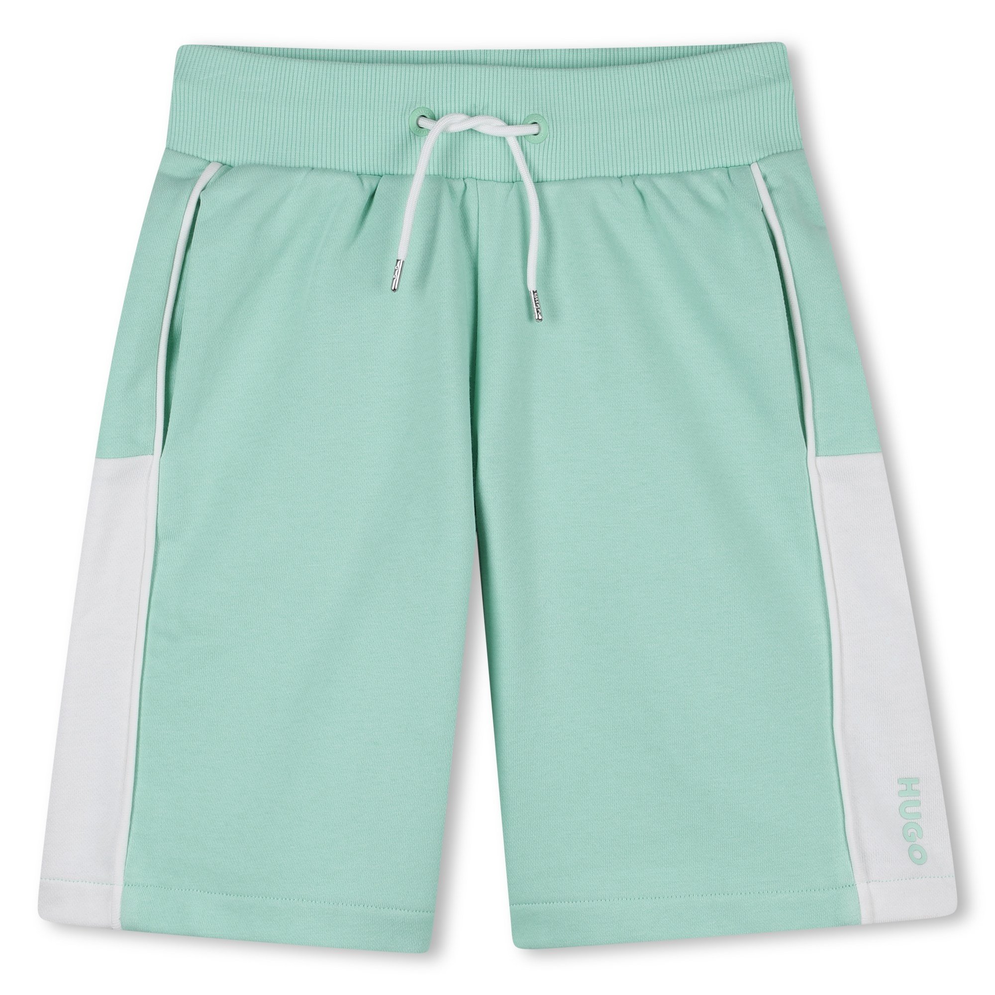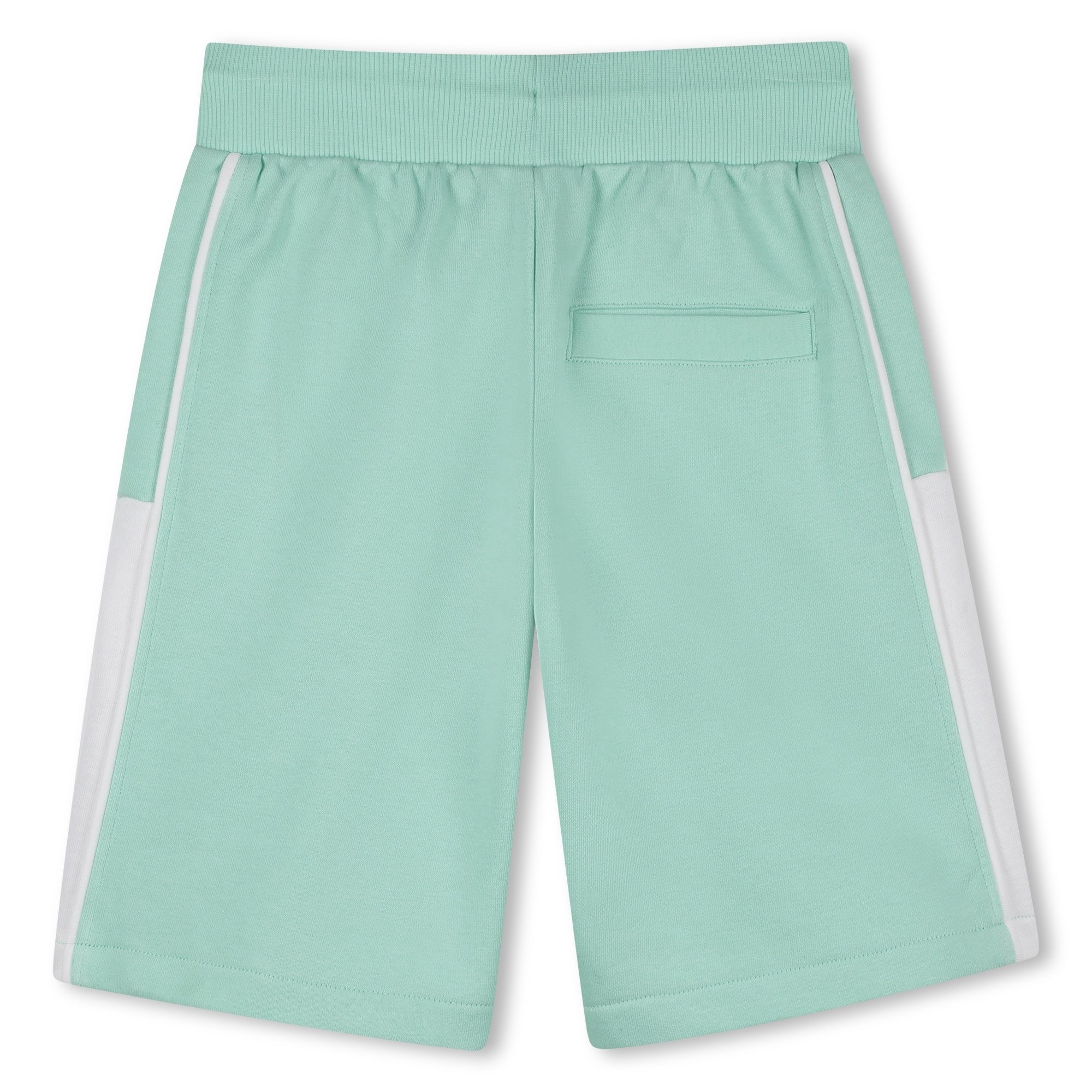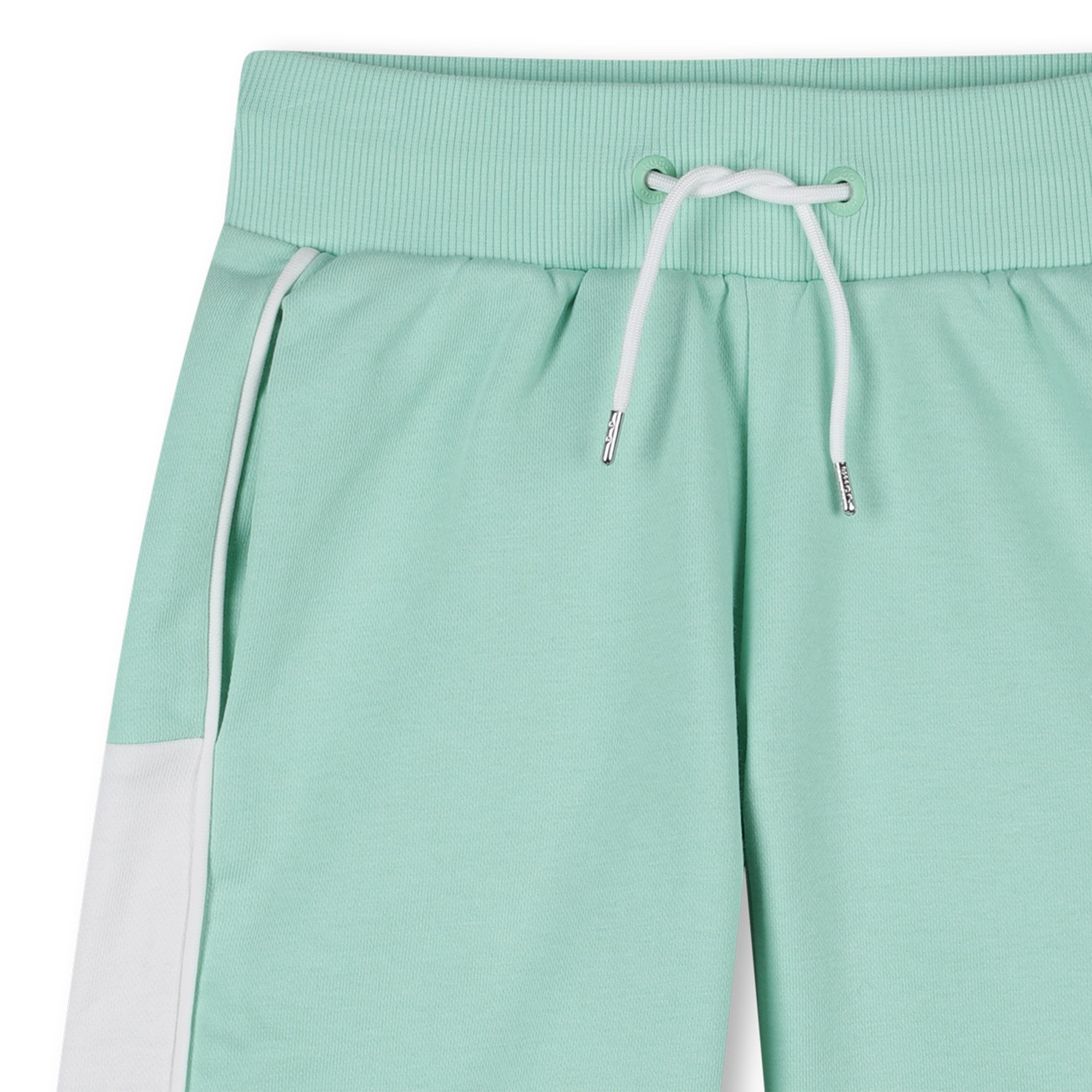 • Turquoise and white Bermuda shorts with a back pocket. Elasticated waistband with drawstring.
