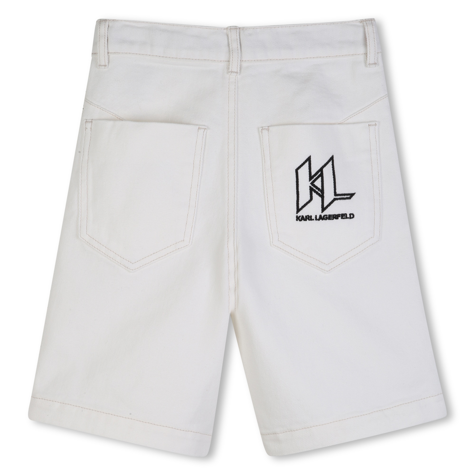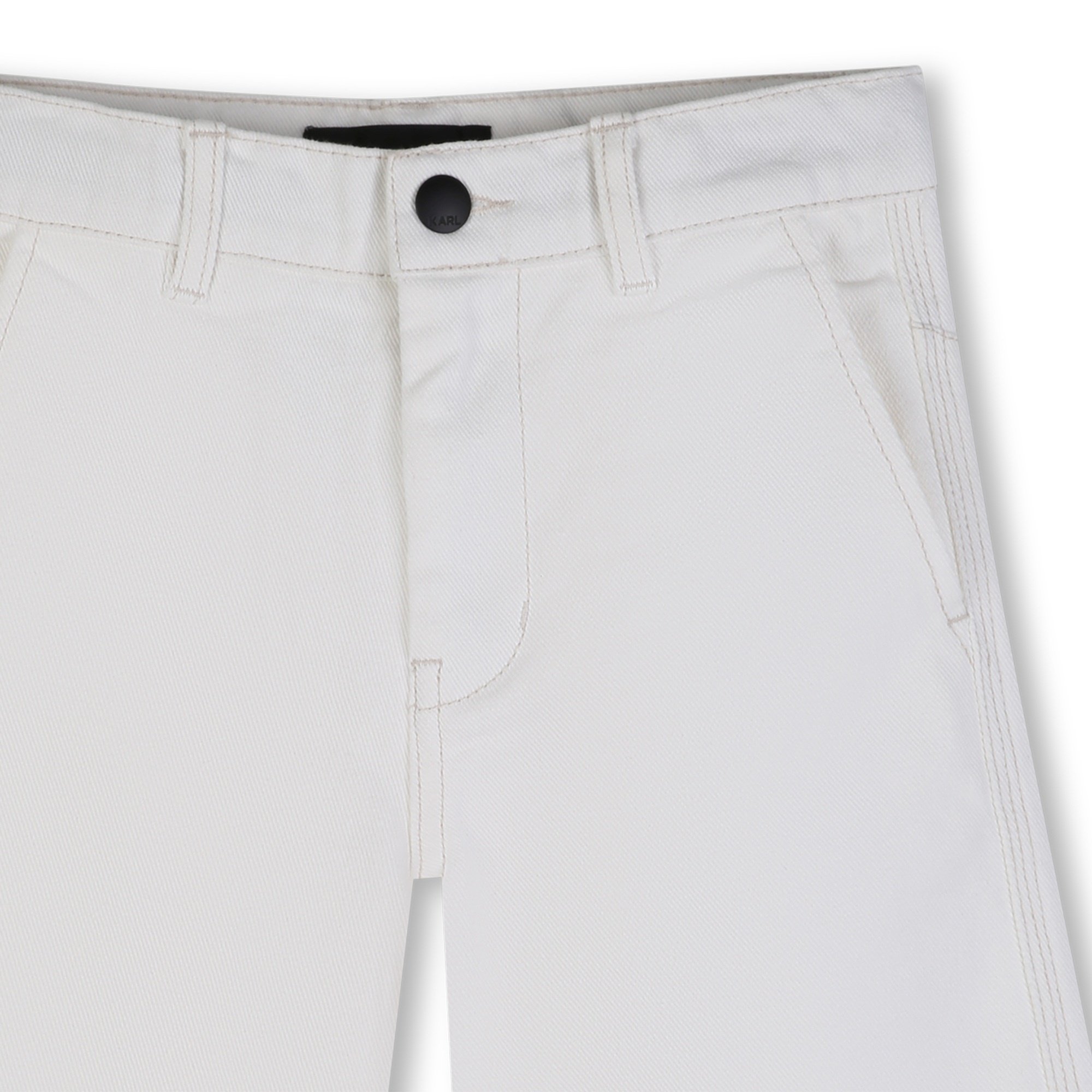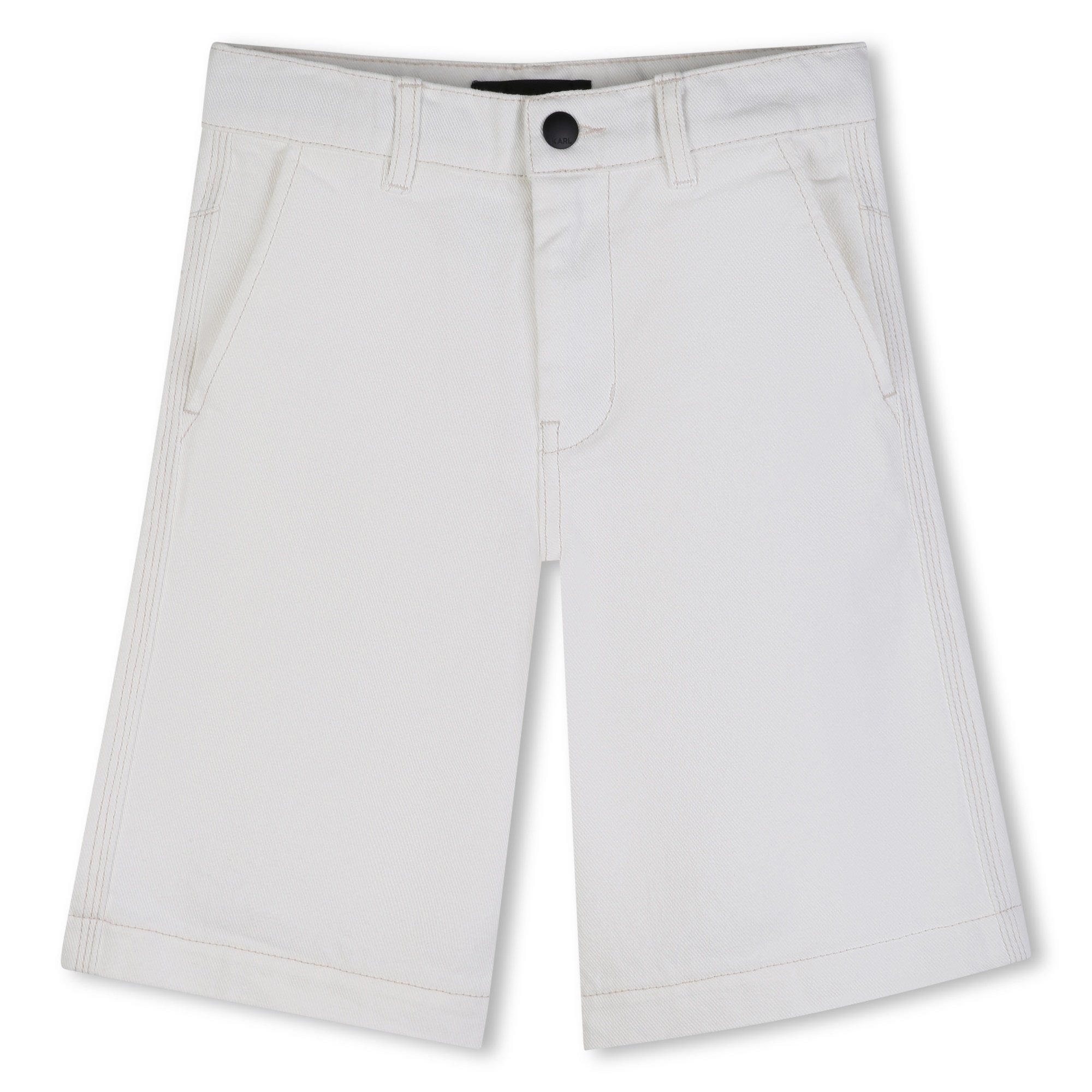 • Cream Bermuda shorts with black woven detail on the back pocket. Zip and button fastening at the front, side and back pockets.